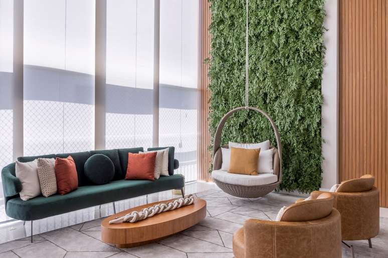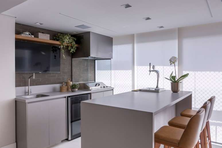 A área social abriga um espaço gourmet com churrasqueira, chopeira elétrica em torre na ilha e duas cervejeiras. Para completar esse local de relaxamento estão um balanço suspenso e poltronas giratórias.