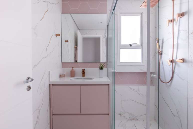 Já o banheiro do filho ganhou um revestimento metro azul da Portinari, contrastando com o revestimento cinza da área do chuveiro. Uma combinação moderna! Para a filha, o rosé gold predominou nos metais, no gabinete rosa milkshake e no revestimento ao estilo calacata branco com detalhes sutis em dourado e bege.