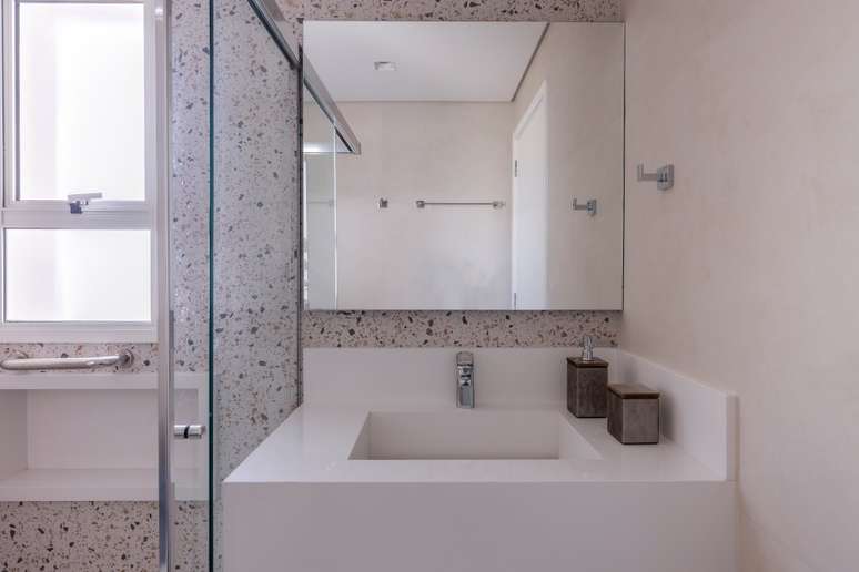 No banheiro dos hóspedes, o porcelanato confete da Ceusa em combinação com o off white recebem as pessoas de maneira nostálgica, lembrando o granilite, material muito utilizado no passado e que retornou às obras nos últimos tempos.