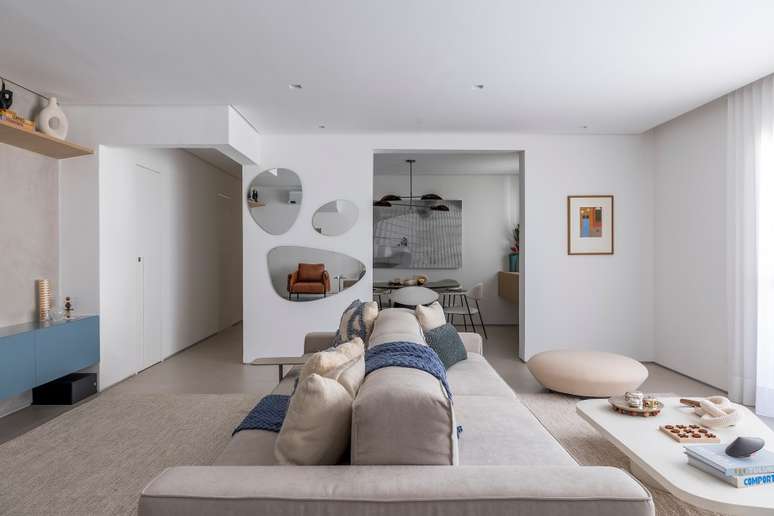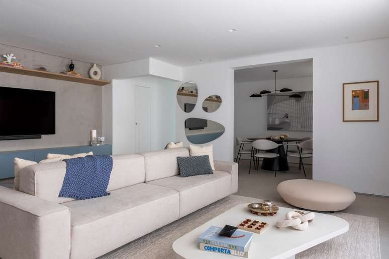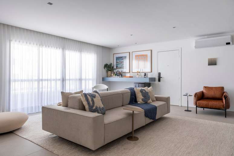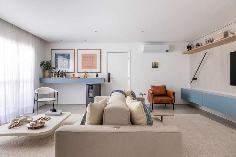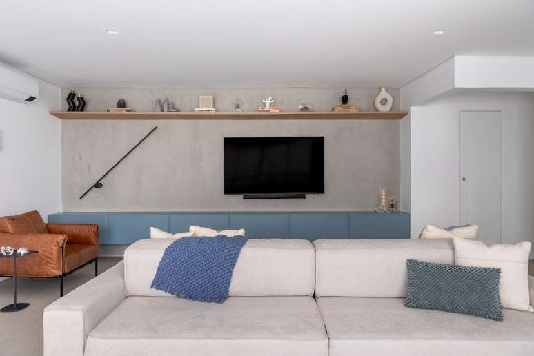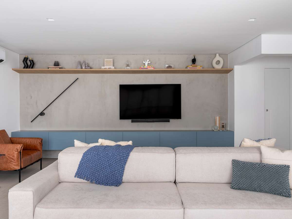 Como o pedido dos clientes era por uma ampla área para receber amigos, um living maior foi criado com a derrubada de paredes e um banco foi incorporado à varanda. O sofá duplo oferece mais assentos para convidados. O rack azul cria pontos de cor em meio à paleta neutra.