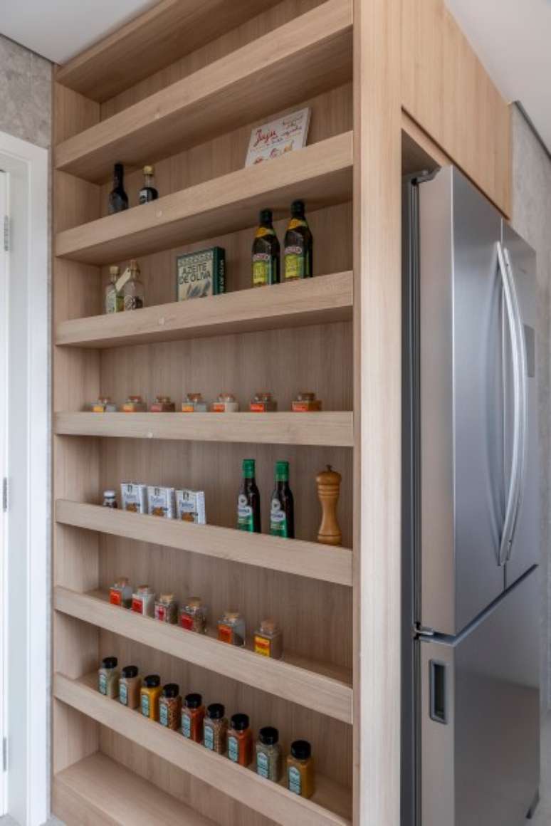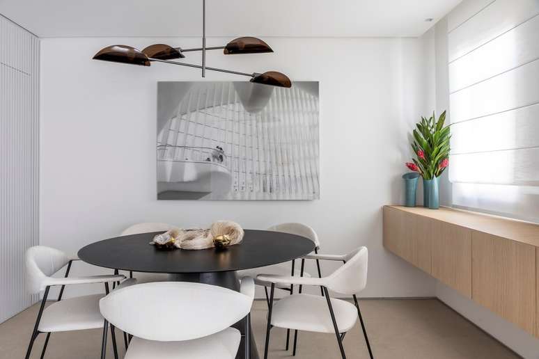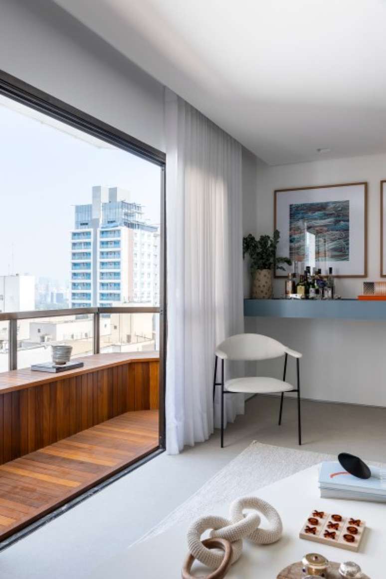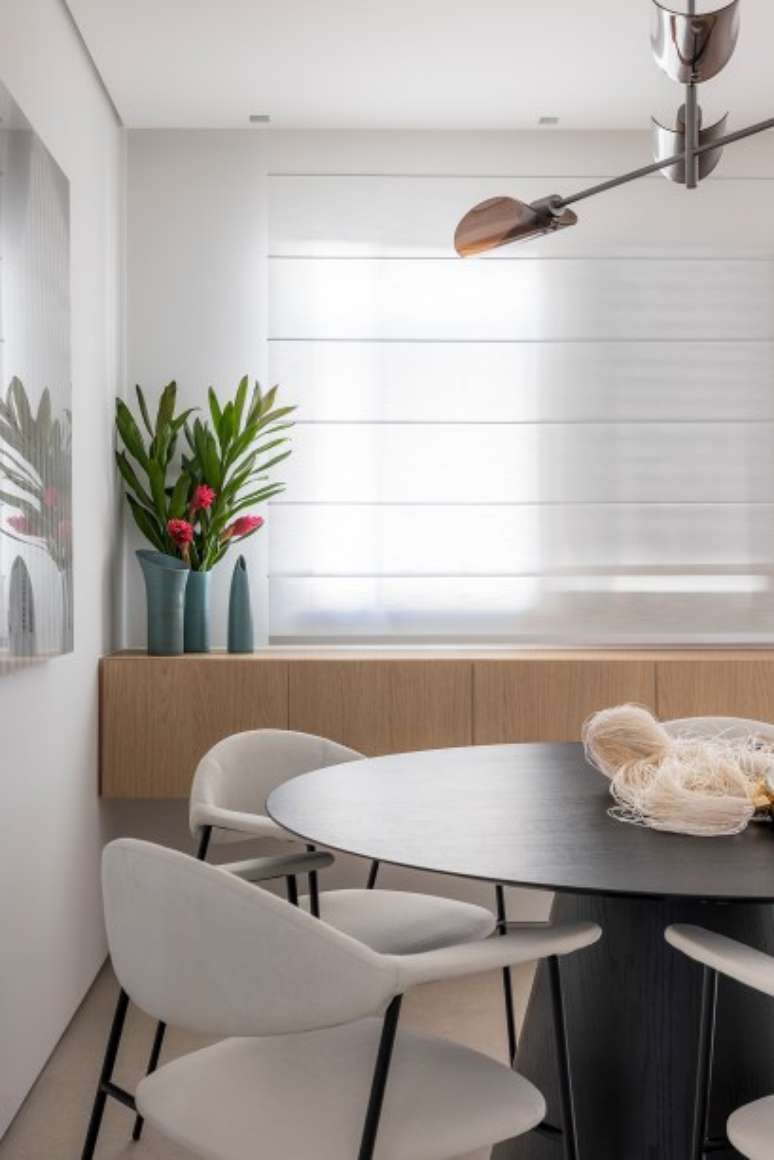"A viga da sala para o corredor não permitiu que a gente abrisse o jantar completamente. Mas, no fim, aproveitamos a estrutura para criar o painel ripado", explica o escritório.