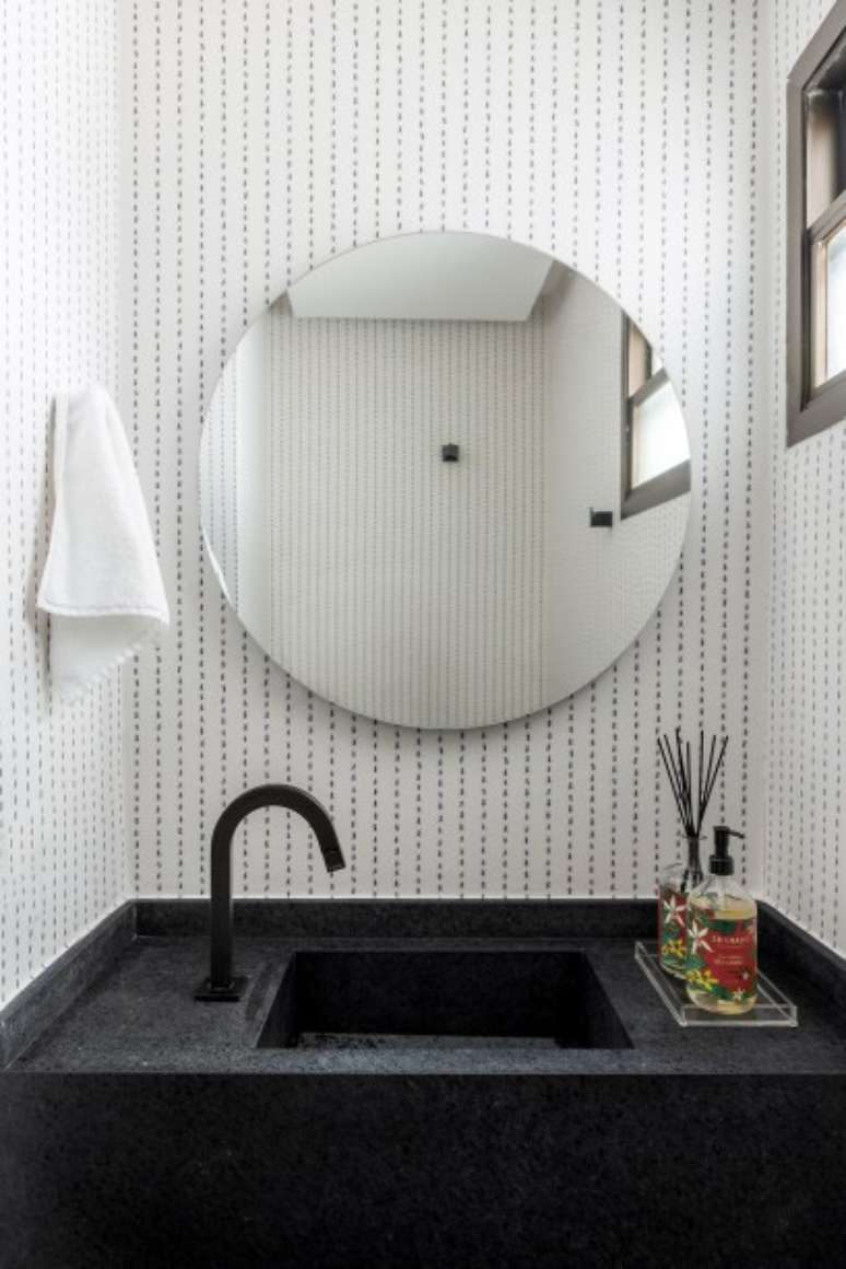 No lavabo, as riscas na parede são, na verdade, desenhos de formigas do papel de parede. A pia esculpida e o espelho redondo completam o ambiente.