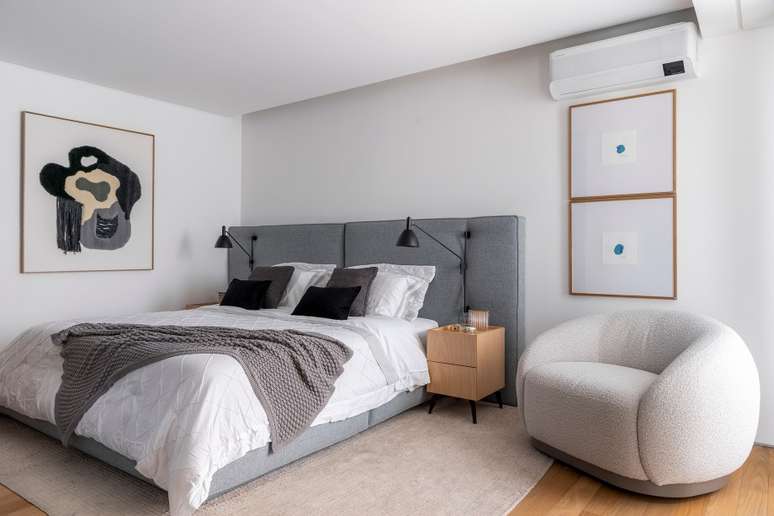 Preto, branco e cinza - com toques de azul - caracterizam este projeto assinado por Next Arquitetos
