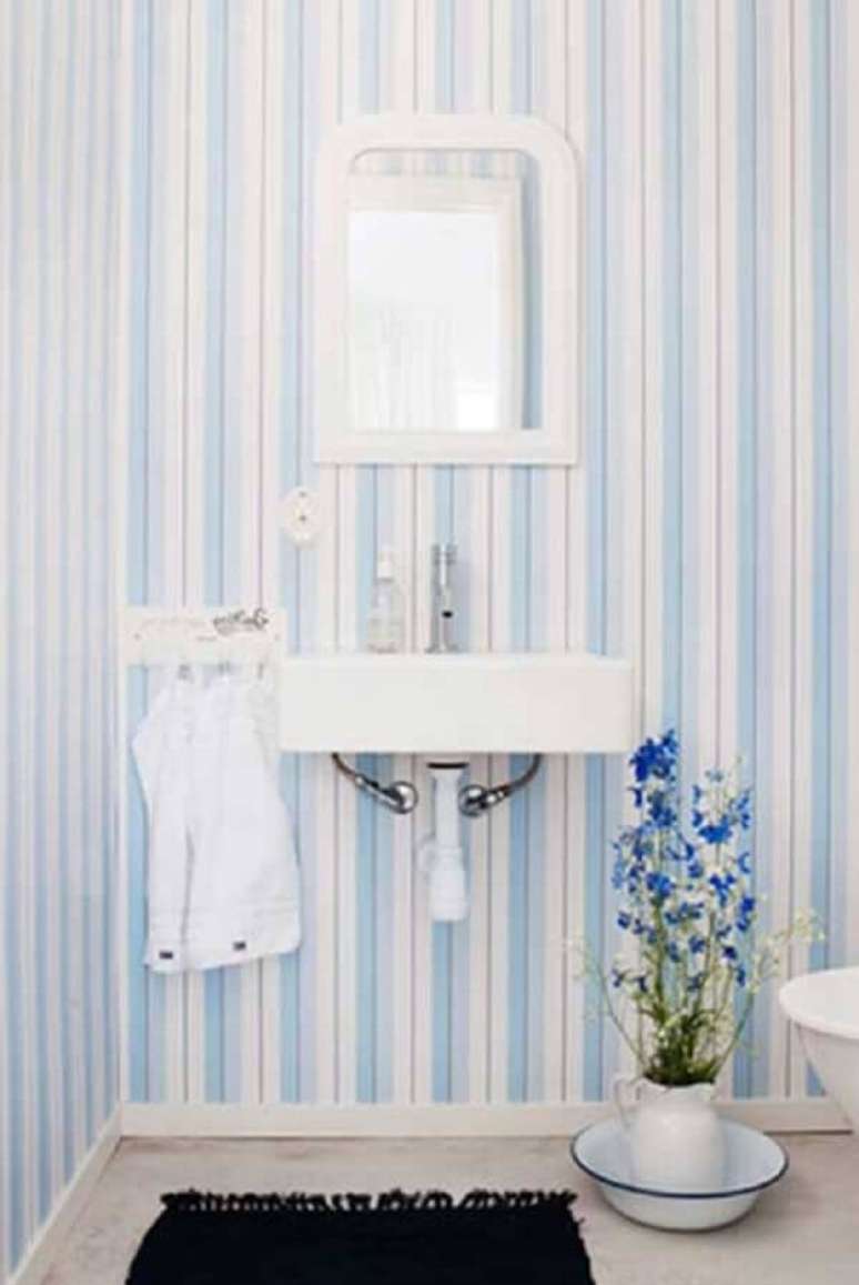 44- O papel de parede para lavabo pequeno listrado cria uma sensação de profundidade no ambiente. Fonte: Rico Mendonça