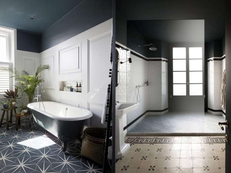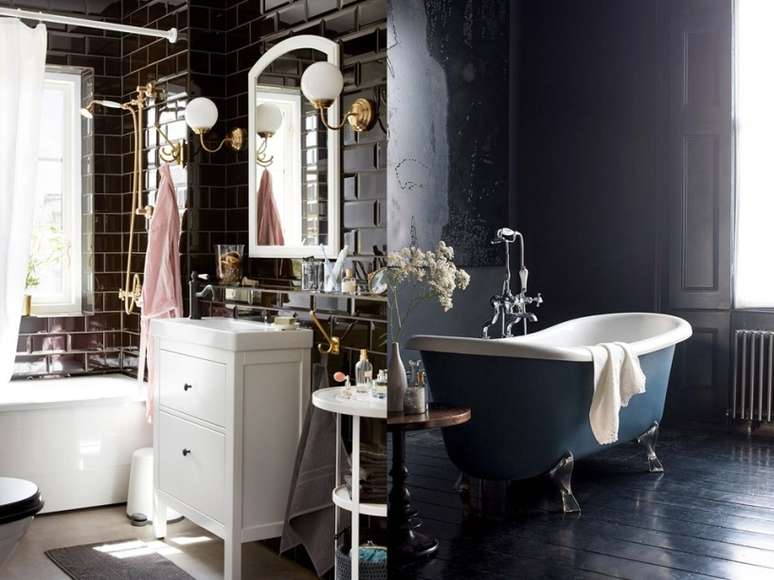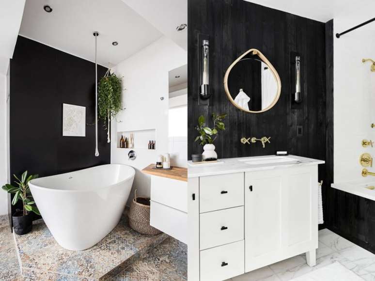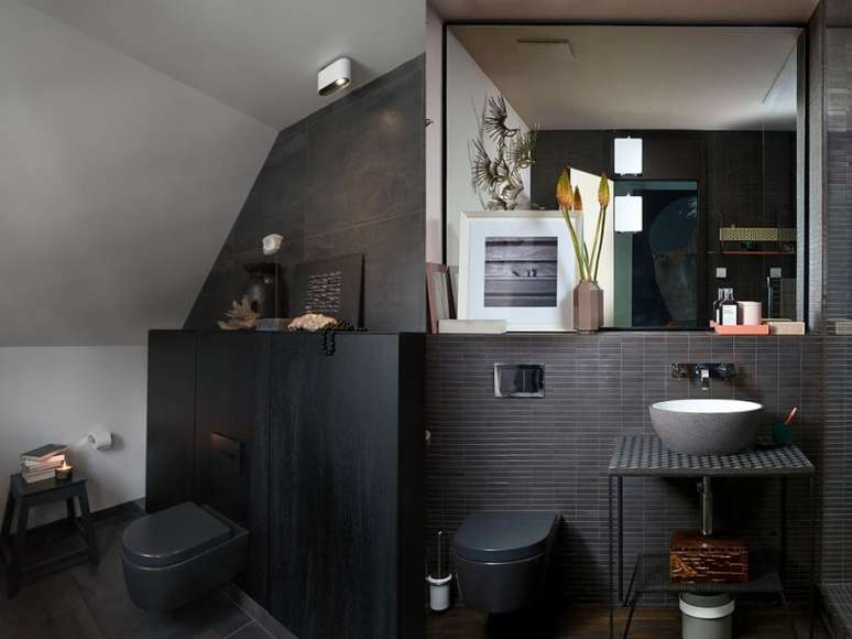 Você pode incorporar toques de preto em seu banheiro de muitas maneiras diferentes. Na escolha do azulejo ou na pintura das paredes ou teto. Mas também pode trazer o preto com uma banheira, acessórios ou até no vasos sanitários.
