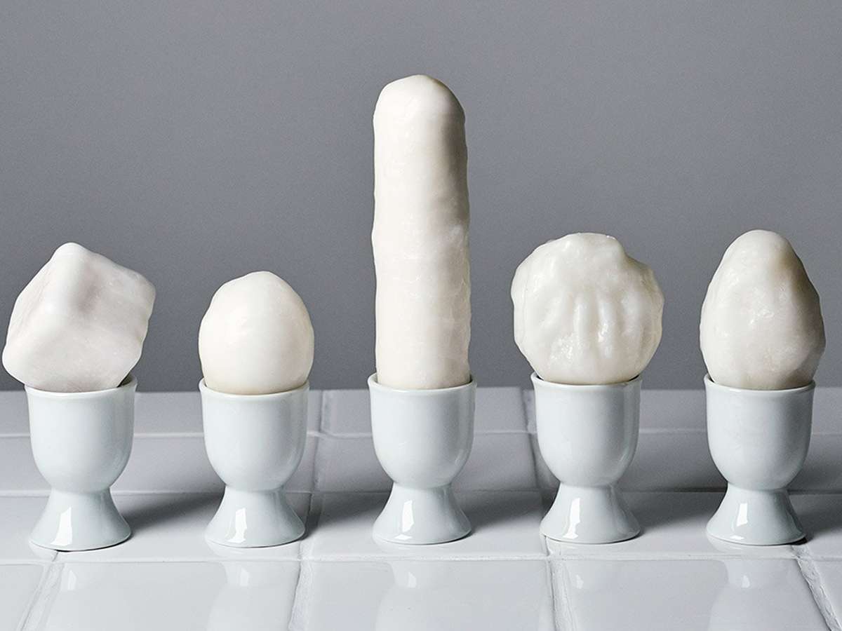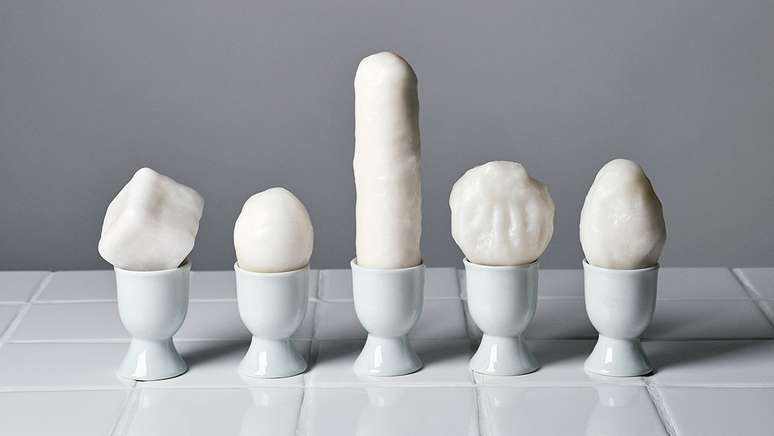 Annie Larkins, graduada da Central Saint Martins, Londres, aborda questões de produção de alimentos com sua alternativa aos ovos de galinha de formatos peculiares, feita com proteína de ervilha, sal e ácido derivado de algas.