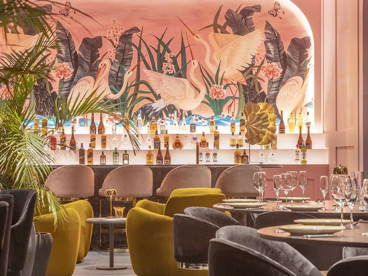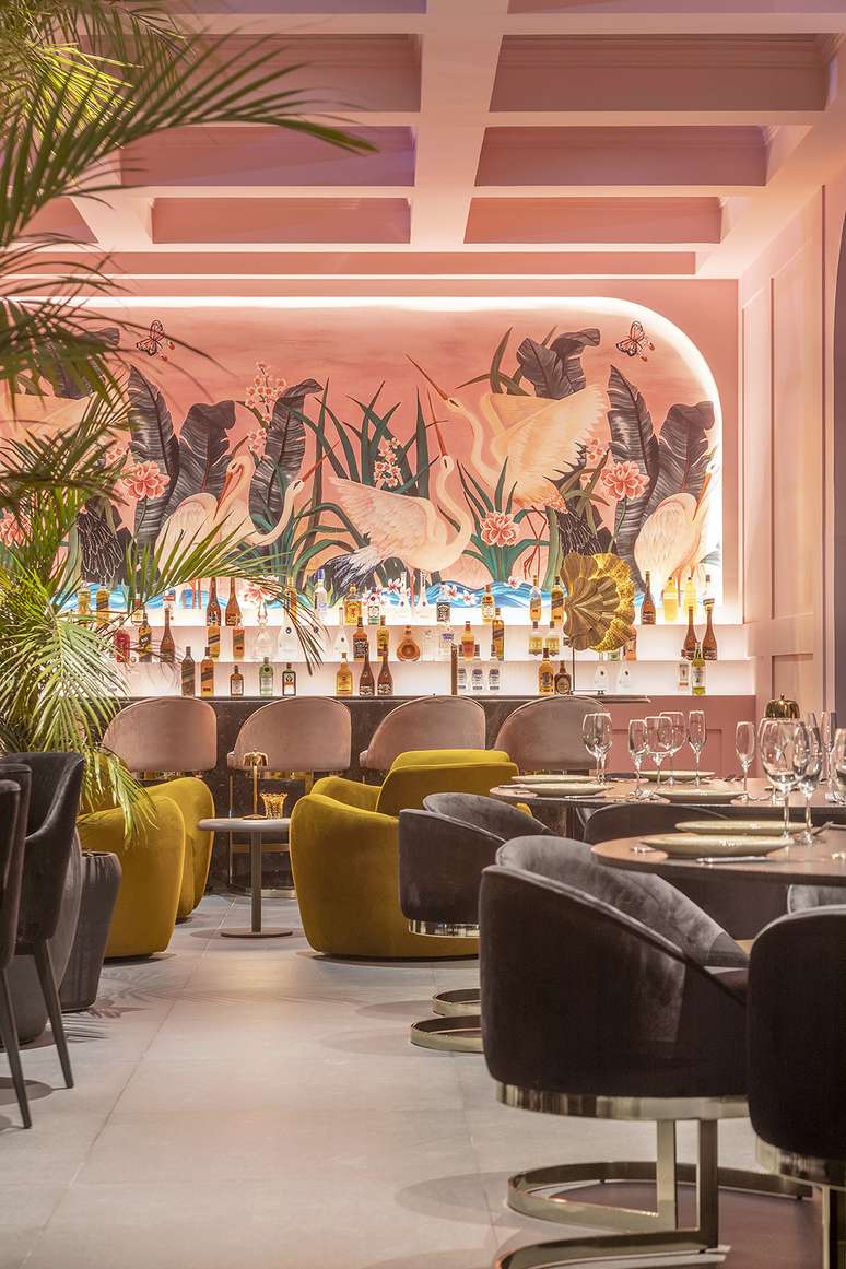 Ao fundo do restaurante, a parede do bar ganhou um papel de parede espanhol que une elementos da natureza, como pássaros, flores e plantas. Não demorou para que a estampa lúdica se tornasse um photo point dos visitantes.
