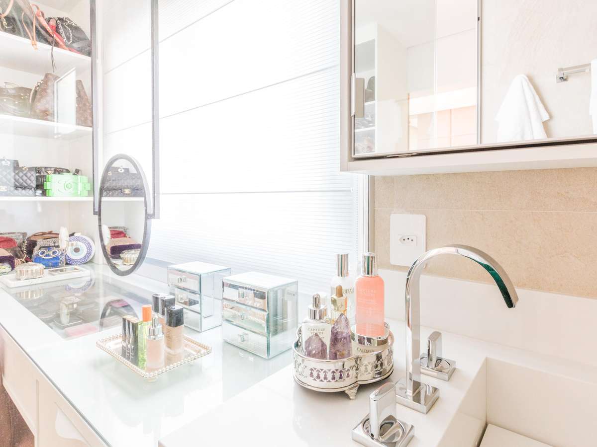 "Mesmo existindo a grande tendência em colocar a penteadeira de frente a um espelho colado na parede, isso não é funcional para maquiagem. O ideal para a penteadeira é ter um espelho o mais próximo possível de quem estiver à frente", explica Daniela.