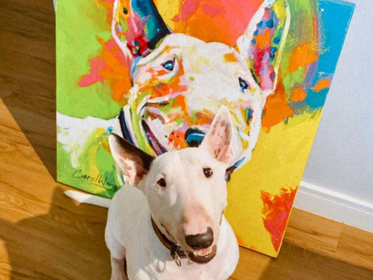 "Quando vou pintar um pet, por exemplo, sempre peço fotos, muitas fotos, uma descrição e, se der, um vídeo. Depois, a gente define uma cor que representa o bichinho. Tem os que são azuis, com personalidade mais calma. Outros têm um fundo super colorido! Cada um tem uma personalidade."