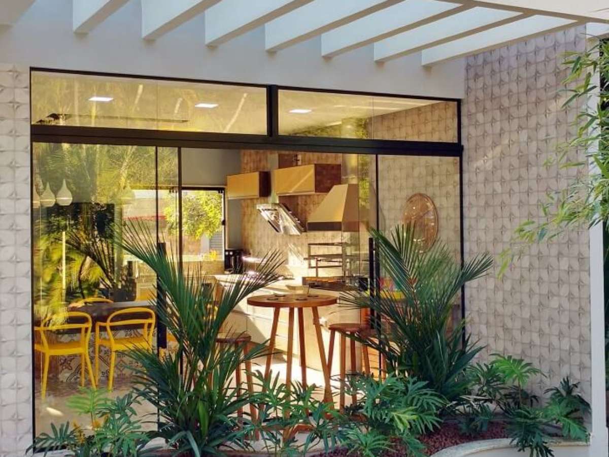 19. Área gourmet aconchegante e pergolado de concreto com vidro. Fonte: Decor Fácil