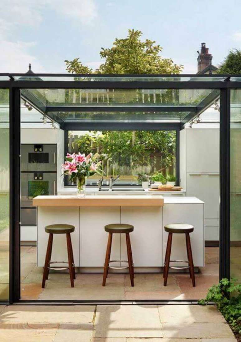 Além do pergolado de ferro com vidro, nós indicamos a cobertura de bambu. Porém, essa opção destaca o estilo vintage e rústico na decoração, então use apenas se você quiser ambientes nesse estilo.