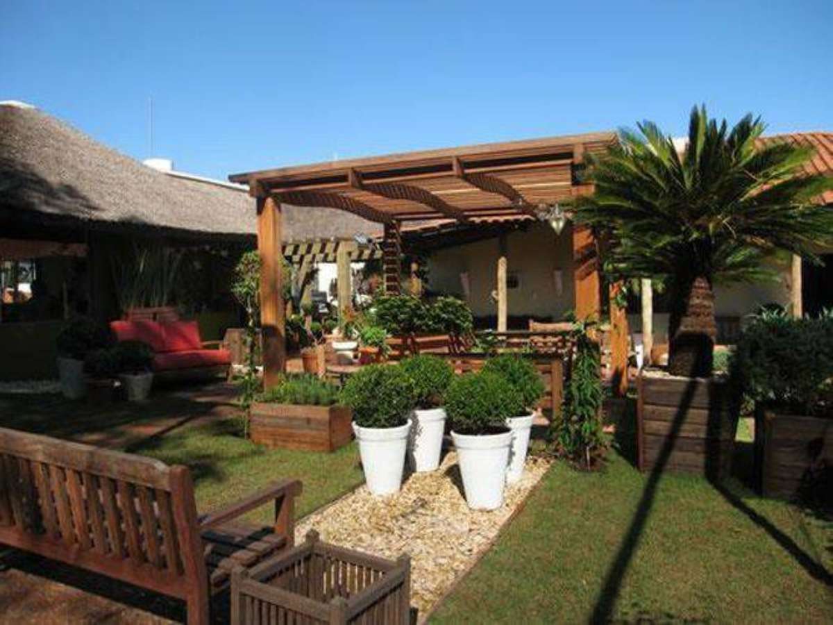 1. Pergolado de madeira com mobiliário rústico e paisagismo belíssimo