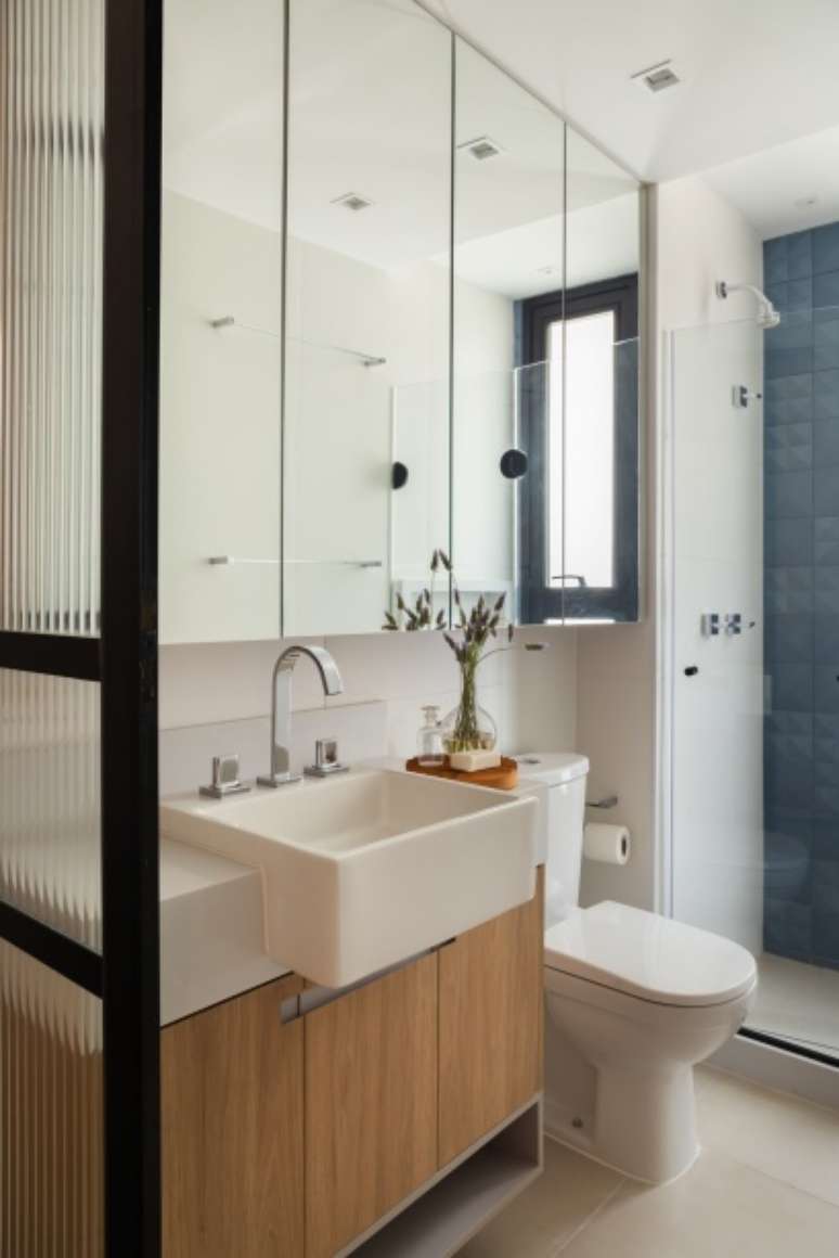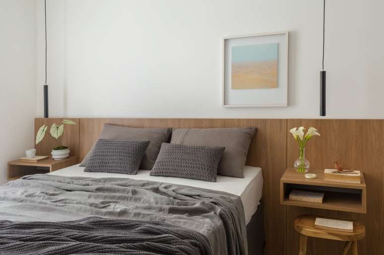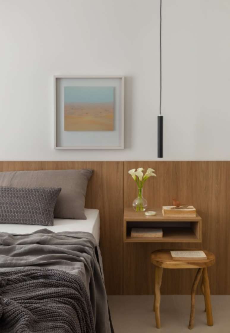 A parede da suíte que era voltada para o corredor íntimo também foi eliminada e substituída por três portas de correr com perfis de madeira e vidro canelado, delimitando o atual home office, que também pode ser usado como quarto de hóspedes.