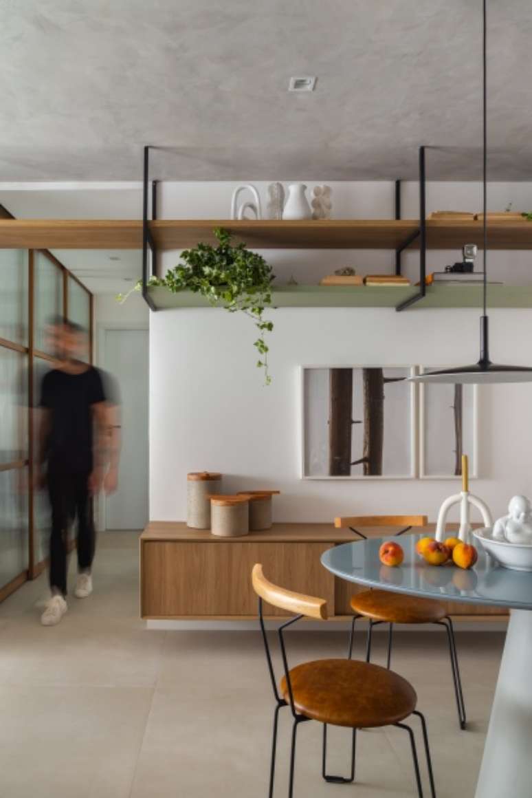No quesito materiais, há uma mescla de madeiras claras, vidro canelado, metal preto e cimento (repare no acabamento do teto) que permeia todos os cômodos para criar uma unidade visual, resultando em uma atmosfera levemente industrial, em sintonia com o espírito jovem do casal.