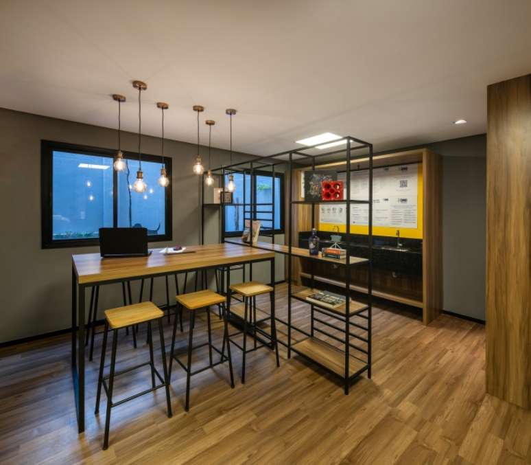Nos andares comerciais, os dois conjuntos, de 130 m² cada, têm brises metálicos que compõem com o jogo de cores e texturas, além de garantirem conforto térmico e luminoso nas áreas internas.