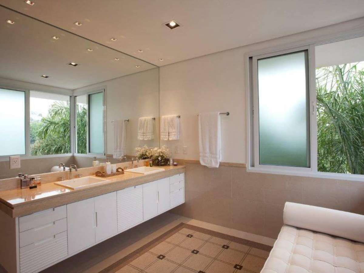 16. Projeto de banheiro com decoração bege e espelho na parede – Foto Aquiles Nicolas Kilaris
