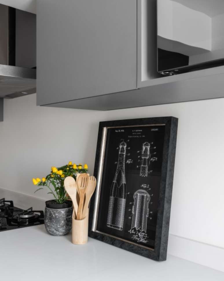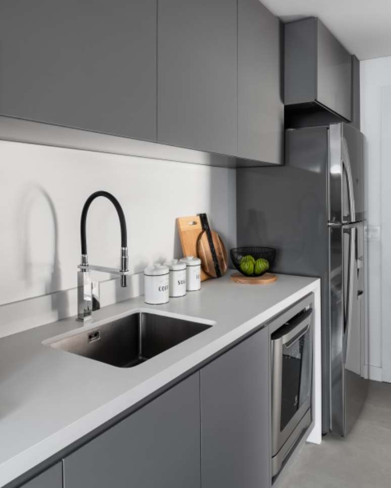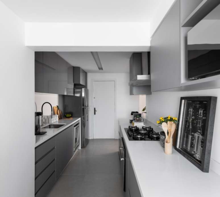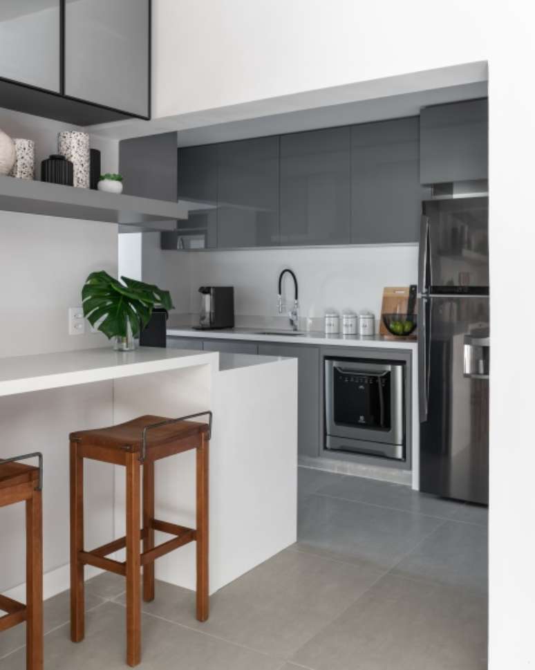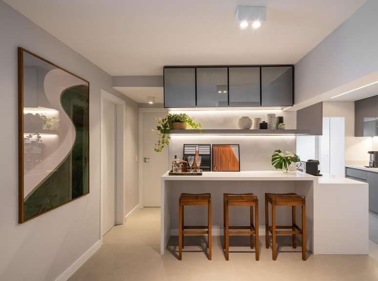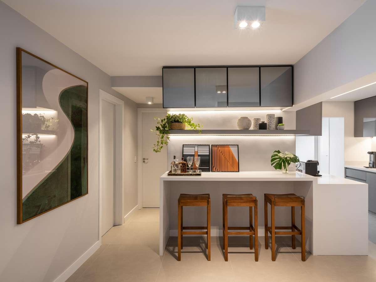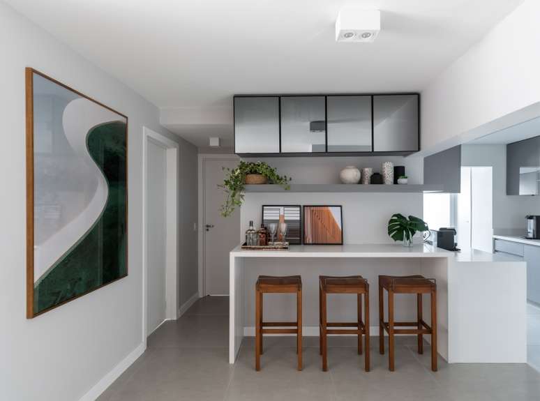Para atender aos pedidos, o escritório Stephanie Toloi Arquitetura e Interiores e a arquiteta Natasha Capusso integraram a cozinha, lavanderia e sala - o que permitiu a criação de uma área de bar com banquetas e armários superiores com vidro espelhado. Estes três ambientes funcionam como um só e apresentam tons de cinza e branco, cores que oferecem contraste e um cenário atemporal.