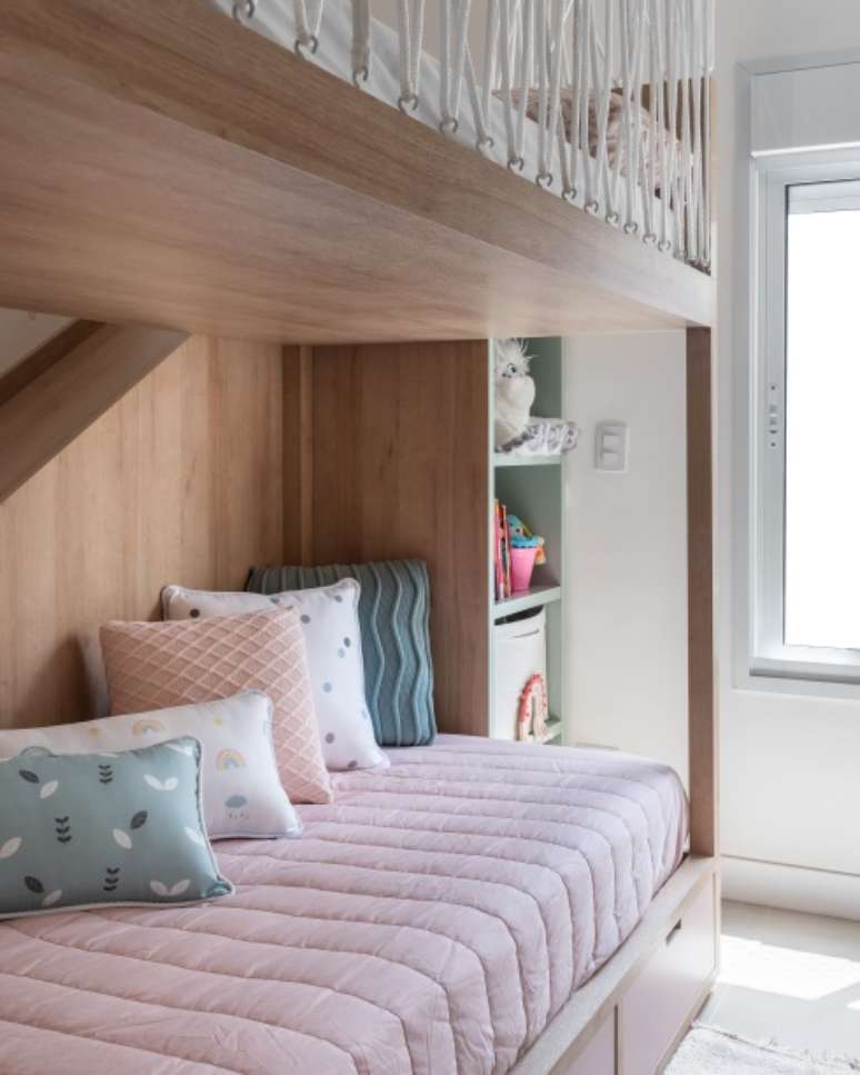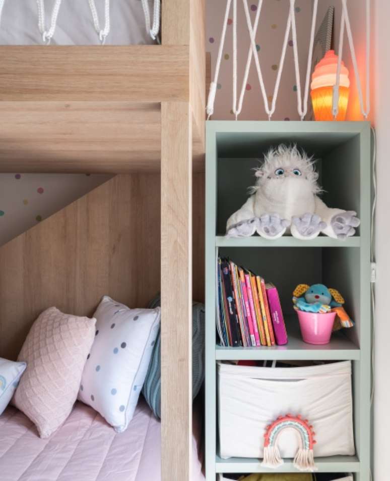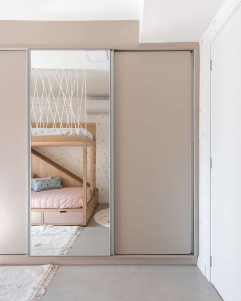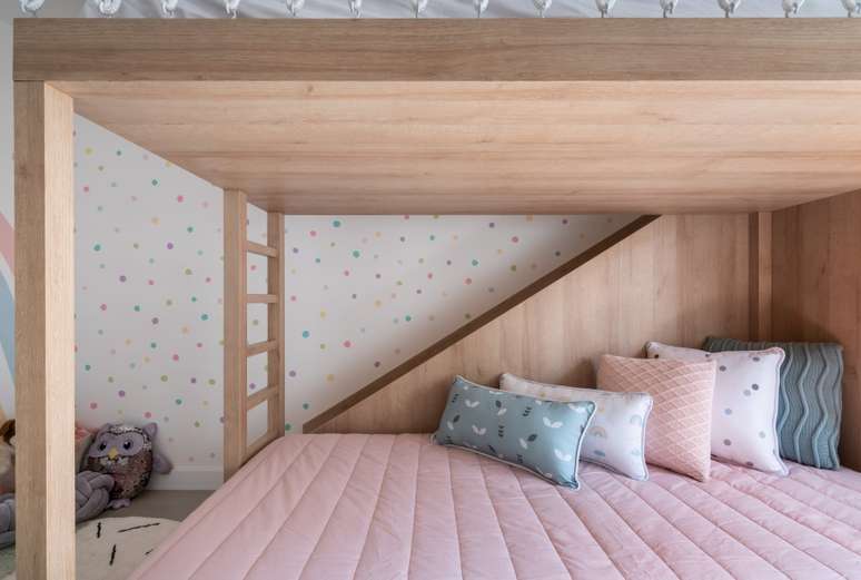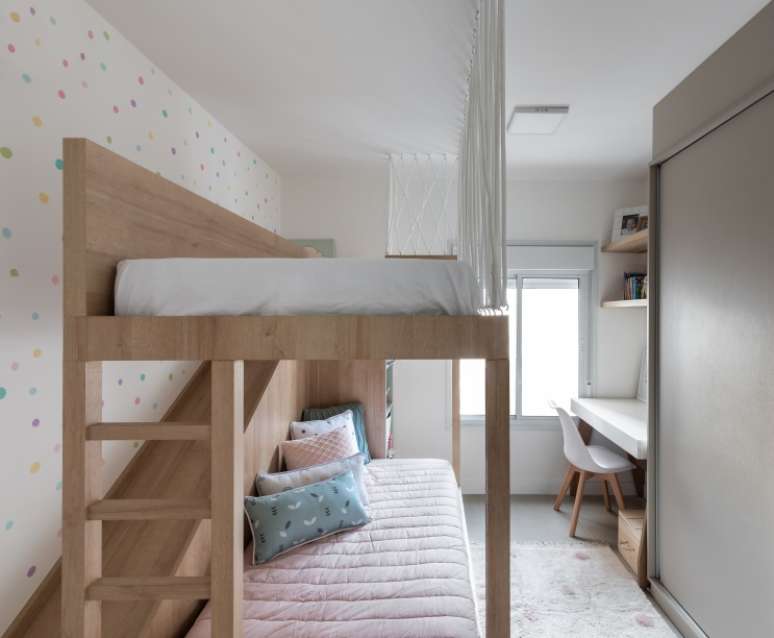 Porém, o destaque do projeto está no quarto da pequena, que recebeu áreas de diferentes atividades e brincadeiras, pois o condomínio não possui espaço de lazer para crianças. Para criar um ambiente lúdico, foi posicionado um escorredor acoplado a uma beliche com escadas - com uma tela de proteção na cama superior para evitar acidentes.