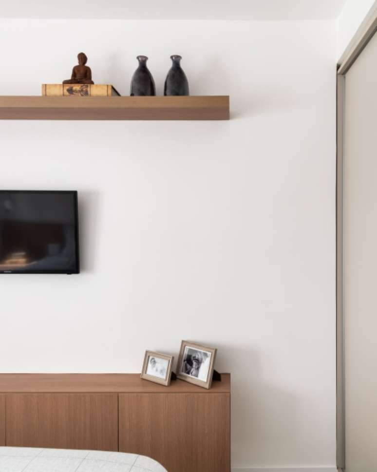 Neste mesmo cômodo, o escritório optou por embutir o móvel da tv no enchimento em drywall da parede, ganhando mais espaço interno. A paleta do cômodo é formada por tons de madeira clara na marcenaria e paredes brancas.