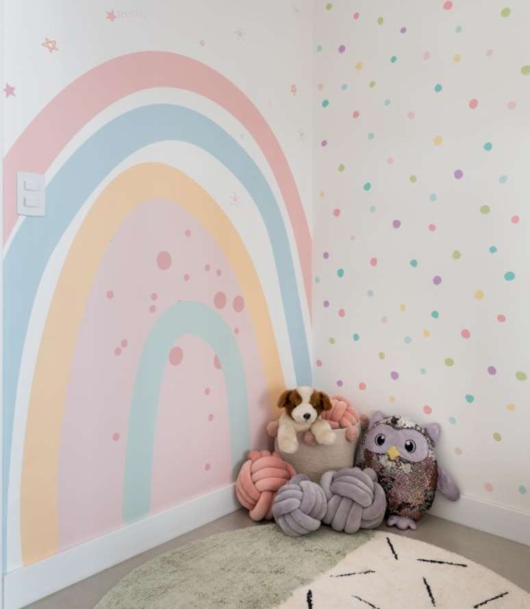 Uma bancada com estantes para os livros; diferentes nichos para armazenar os brinquedos; e uma parede de arco-íris também fazem parte do cômodo. O uso de tons pastéis proporciona cor e uma decoração delicada.
