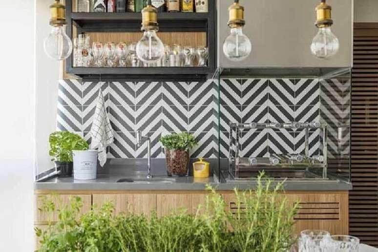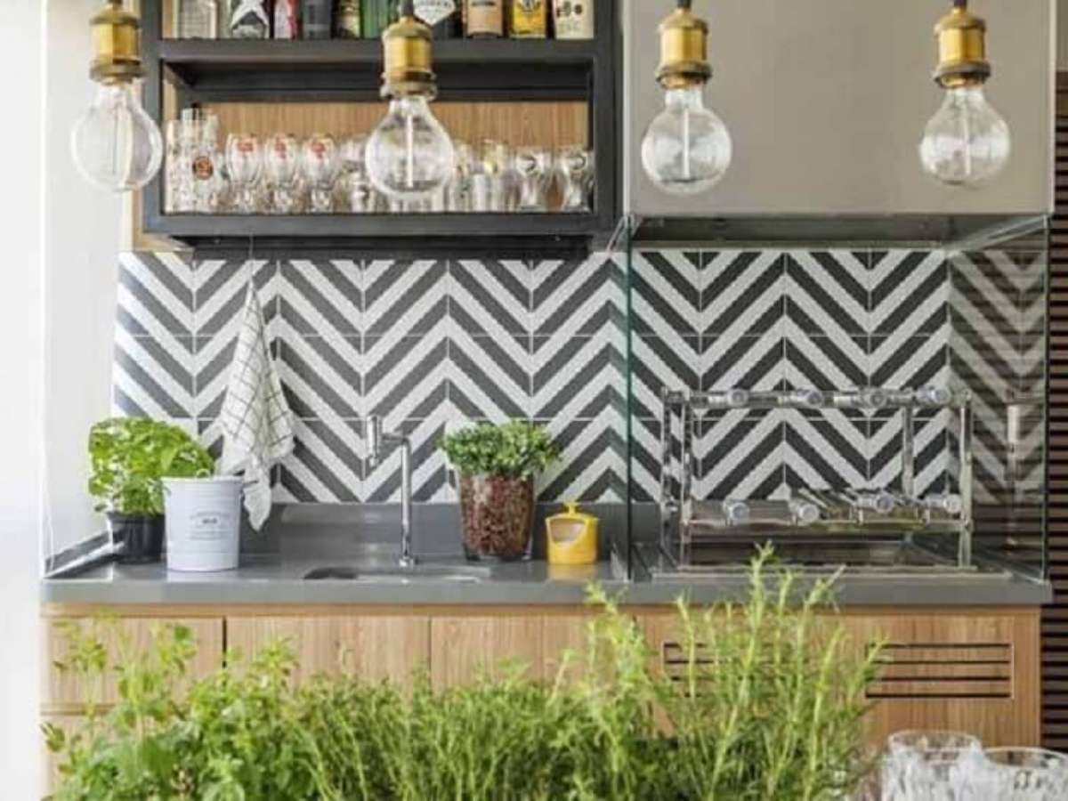 1. Varanda gourmet decorada com quartzo cinza médio com móveis de madeira e revestimento geométrico na parede – Foto: Decor Fácil