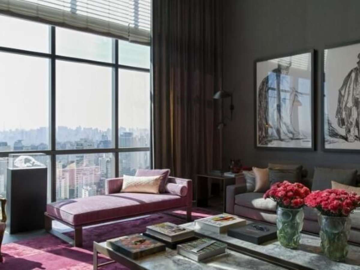 28. Sala de estar com recamier vinho em decoração com toques de vinho. Projeto de Marilia Veiga