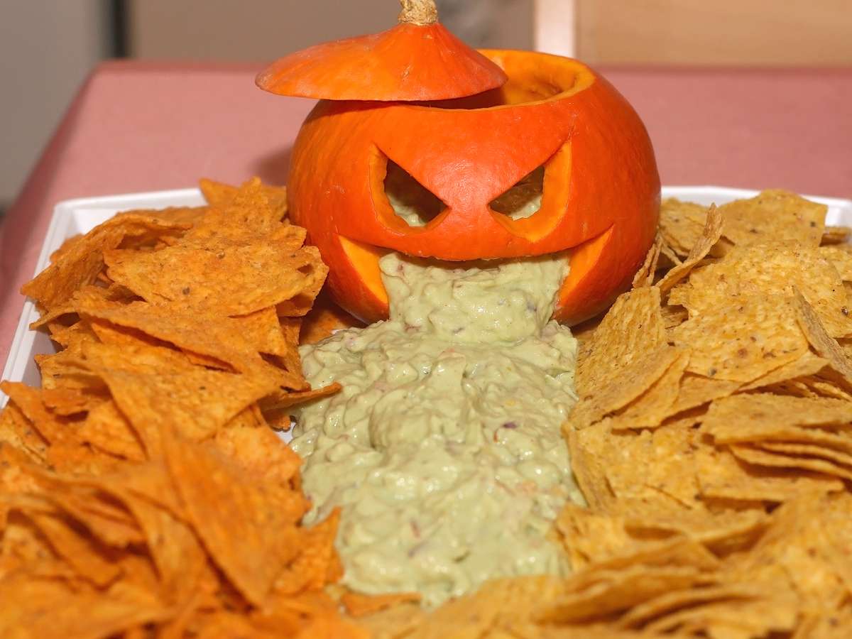 Corte uma tampa nas miniabóboras. Faça cortes em sua lateral no formato de um rosto. Leve para assar por aproximadamente 45 minutos. Após assadas, retira as sementes e a polpa, abrindo espaço para o recheio. Recheie com o guacamole e sirva acompanhado de chips de legumes ou palitinhos de cenoura.