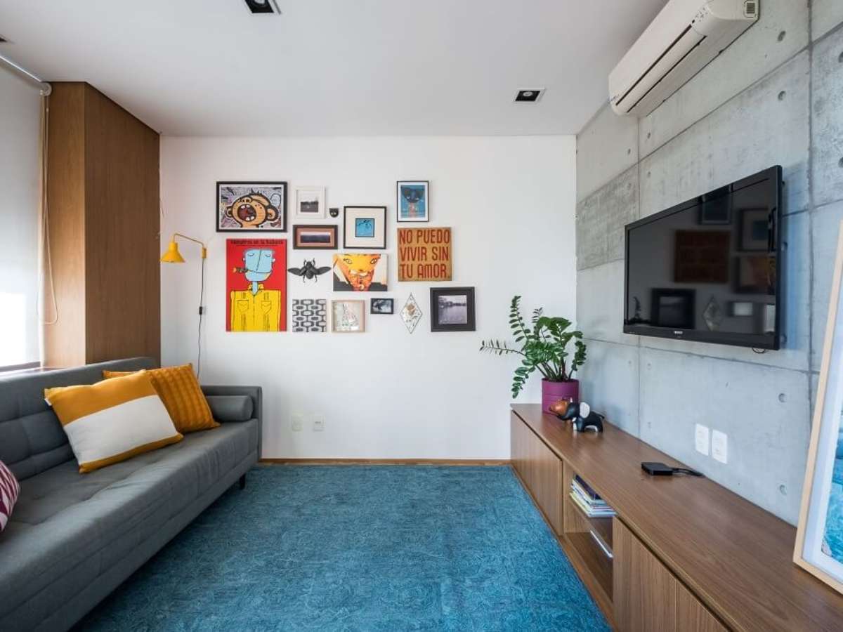 A sala de TV do apartamento duplex ganhou revestimento cimentício em uma das paredes e algumas obras de arte na outra. Quadros com frases, desenhos abstratos e geométricos garantiram um visual moderno e repleto de cores. Rack de madeira, sofá cinza e tapete azul complementam a decoração da sala de TV, trazendo conforto aos moradores do imóvel.