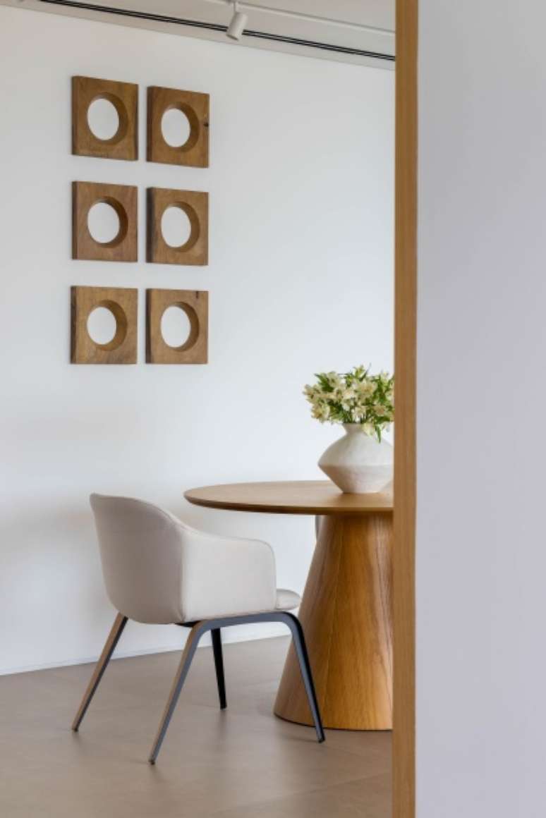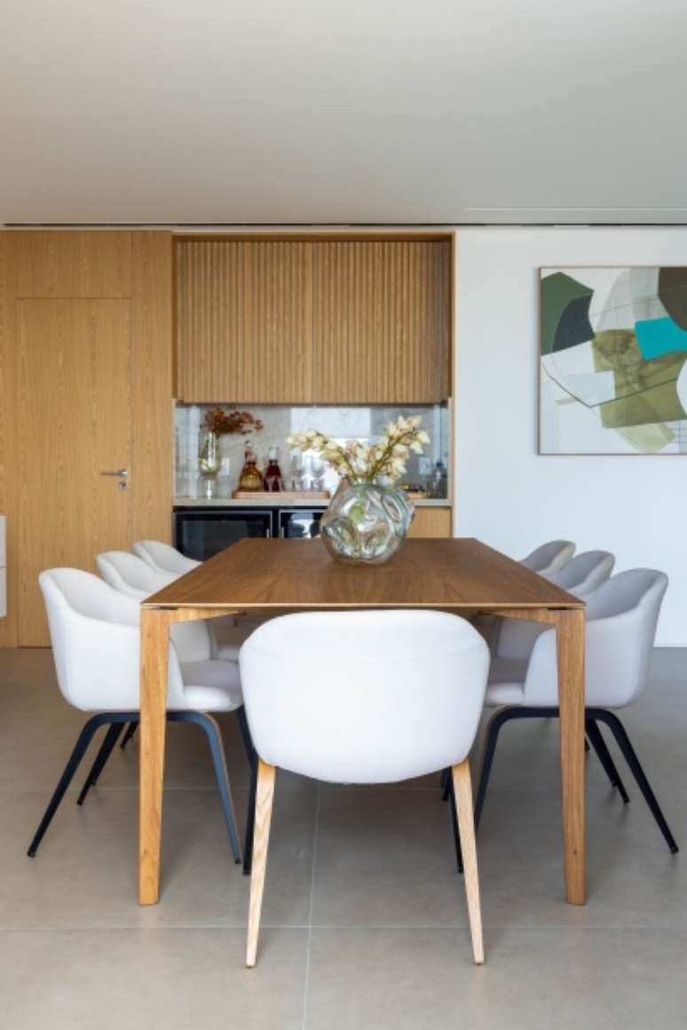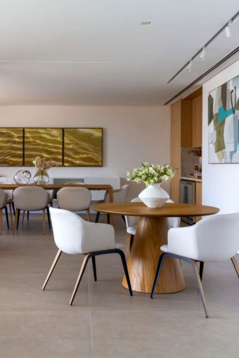 Entre as peças de design assinado, vale ressaltar a mesa de jantar Dinn (de Jader Almeida), a mesa de centro Ardan (de Larissa Diegoli) e a mesa lateral Claire (do Studio Sette), todas fornecidas pela Way.
