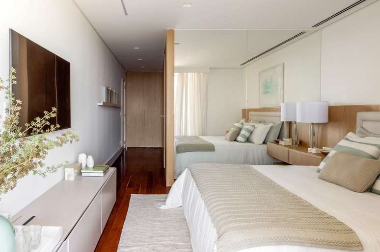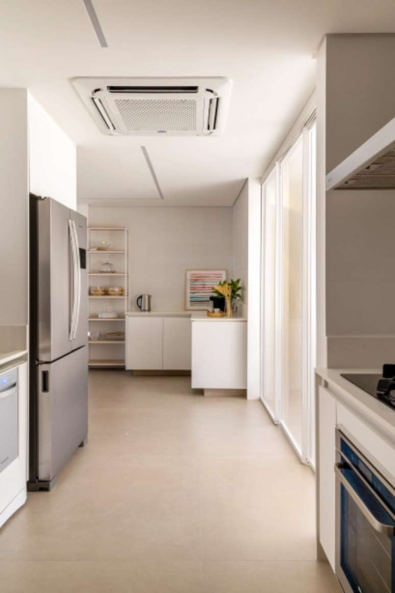 Segundo a dupla, os clientes pediram para integrar as salas de estar e jantar, criar um closet na suíte deles e um espaço com função de copa, ampliar o corredor de entrada da cozinha, e trocar o piso existente em mármore escuro, o sistema de ar condicionado e todas as esquadrias de alumínio, incluindo o guarda-corpo da varanda da sala.