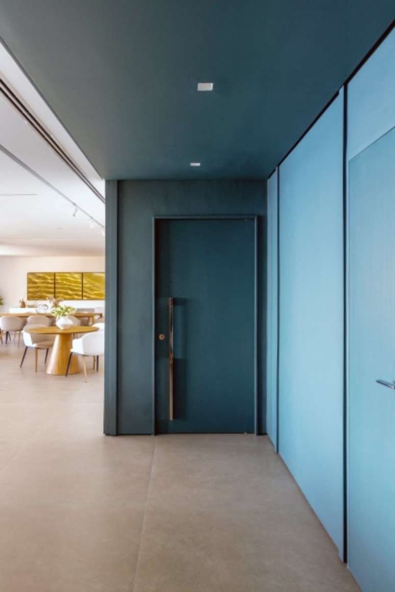 No quesito " paleta de cores, materiais e acabamentos", foi adotada uma base neutra em todo o apartamento, exceto no hall de entrada, que foi pintado de verde azulado (cor Volta ao Mundo, da Suvinil), inclusive o teto e a porta "mimetizada", criando, assim, um efeito de "caixa". Na decoração, no geral, as cores são variações do próprio verde e aparecem pontualmente em acessórios, adornos, quadros e estofamentos para não pesar visualmente nem cansar com o tempo. Já na varanda, predominam tons de cinza, bege e verde.