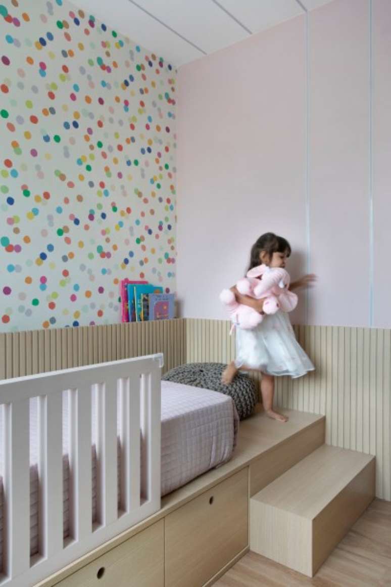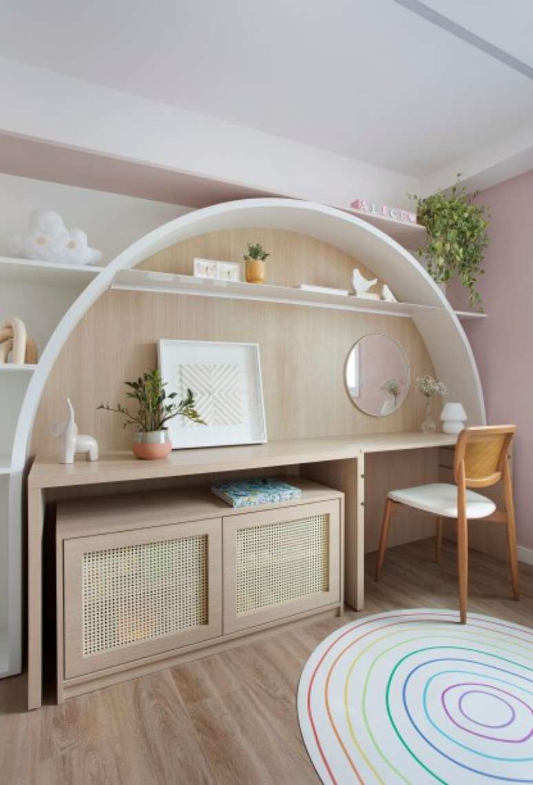 Como o quarto da Alice foi pensado para ser usado pela menina por muitos anos, a arquiteta apostou em cores neutras nos mobiliários e deixou para dar o tom infantil, mais colorido, no papel de parede e nos tapetes.