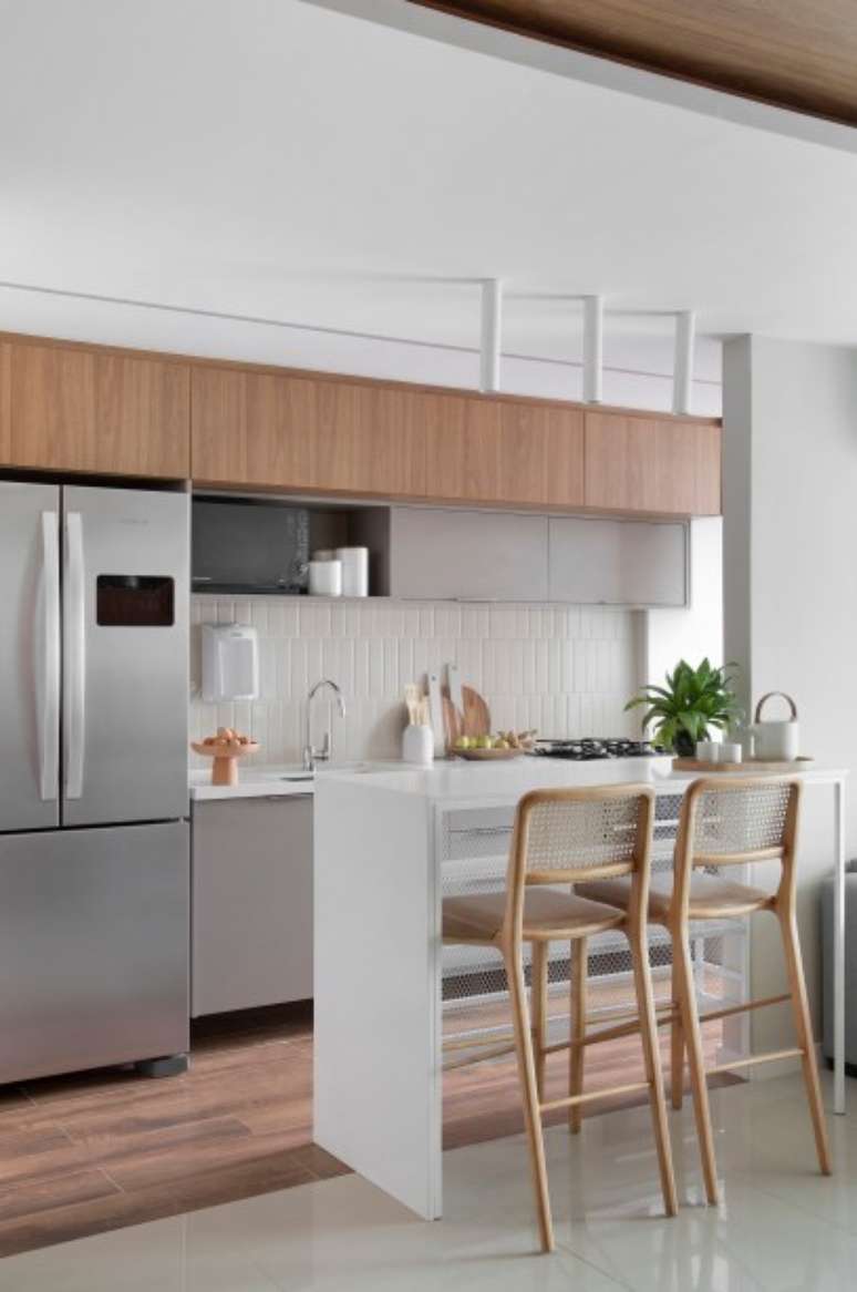 O projeto, assinado por Gabriela Ikeda, do escritório Ikeda Arquitetura, renovou os revestimentos e apostou no mobiliário planejado.