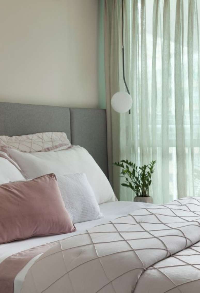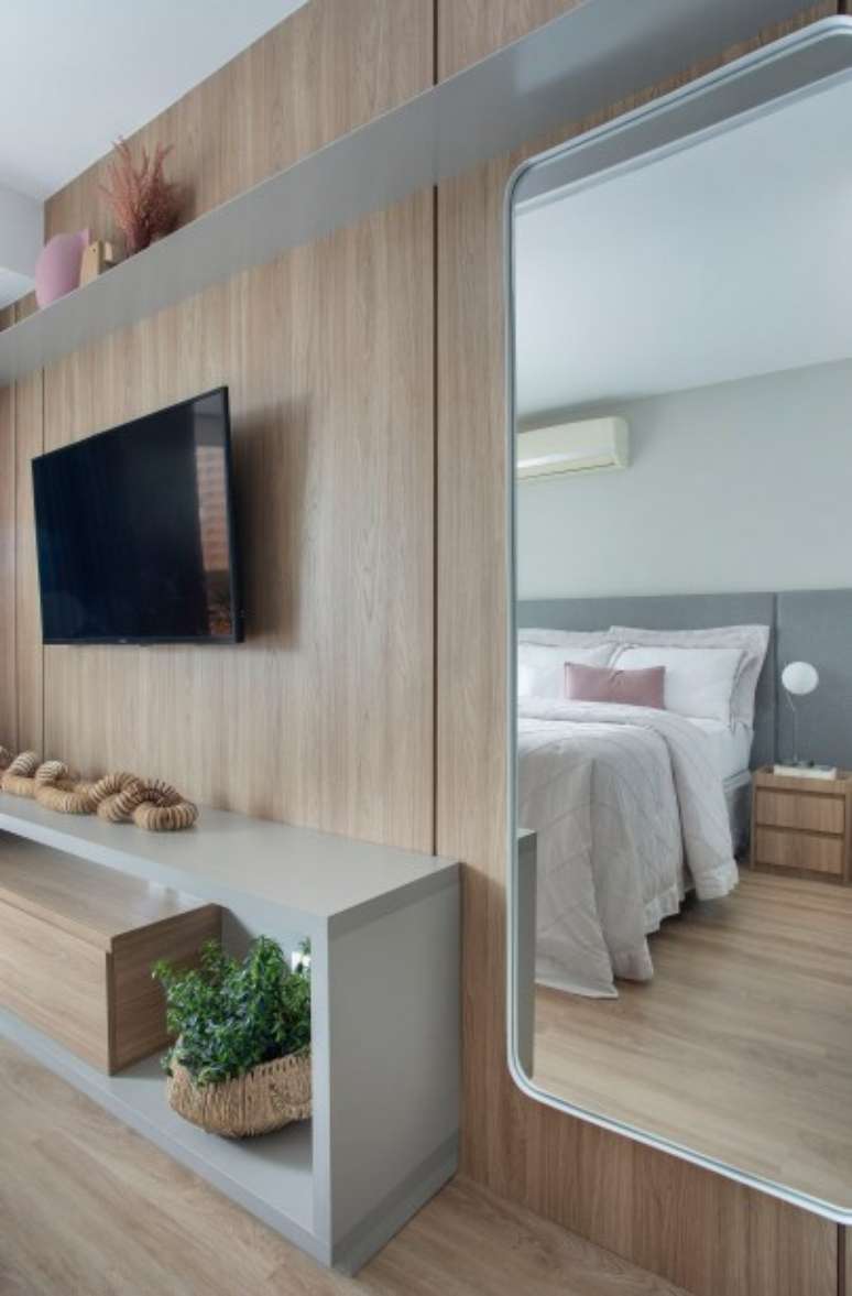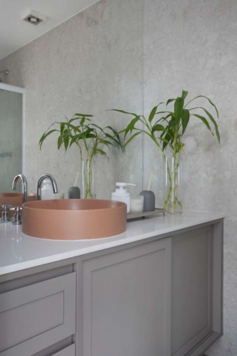 Já no quarto do casal, decorado predominantemente em tons neutros, o destaque fica por conta da mistura de materiais. Aqui, arquiteta combinou serralheria pintada de cinza, madeira e estofamento em tecido na cabeceira. No banheiro, a cuba de sobrepor, em tom terroso, rouba a cena.