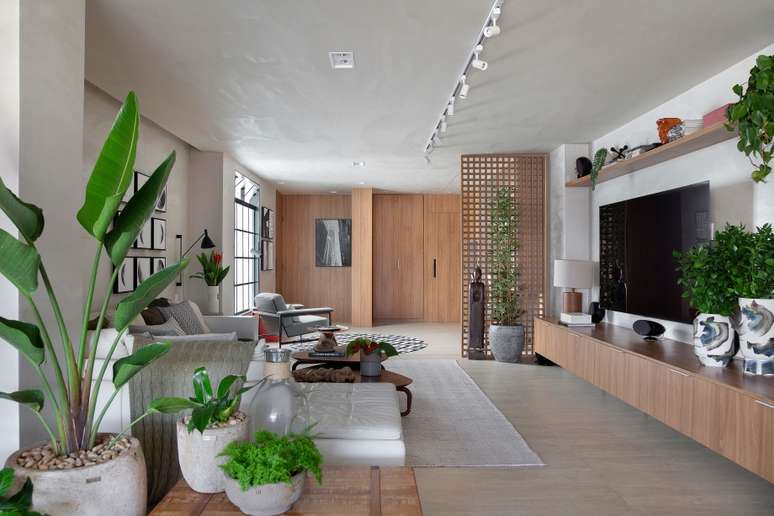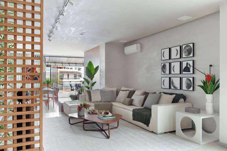 Na área social, os arquitetos apostaram em uma paleta de tons neutros para criar uma atmosfera ao mesmo tempo calma e sofisticada, deixando as cores mais vibrantes para objetos, almofadas e quadros.