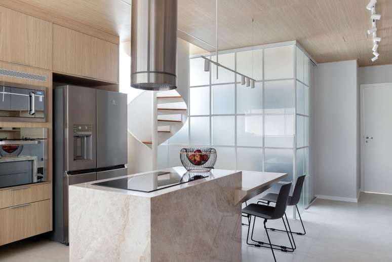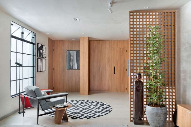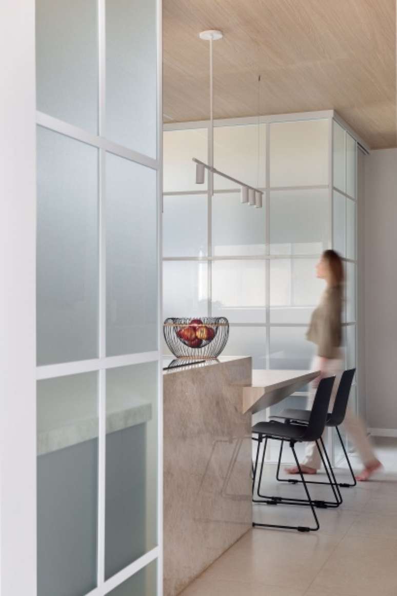 "Os clientes pediram para modernizar o apartamento, pois a planta original era muito antiga e já não atendia às necessidades da família. Como ambos trabalham de casa com frequência, eles pediram também um escritório compartilhado, que foi alocado em uma parte reservada da sala, tirando partido não só da amplitude como também da iluminação natural farta no local", conta o arquiteto Thiago.
