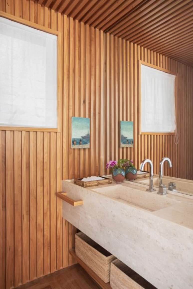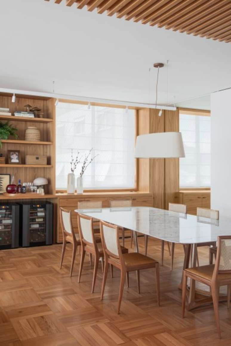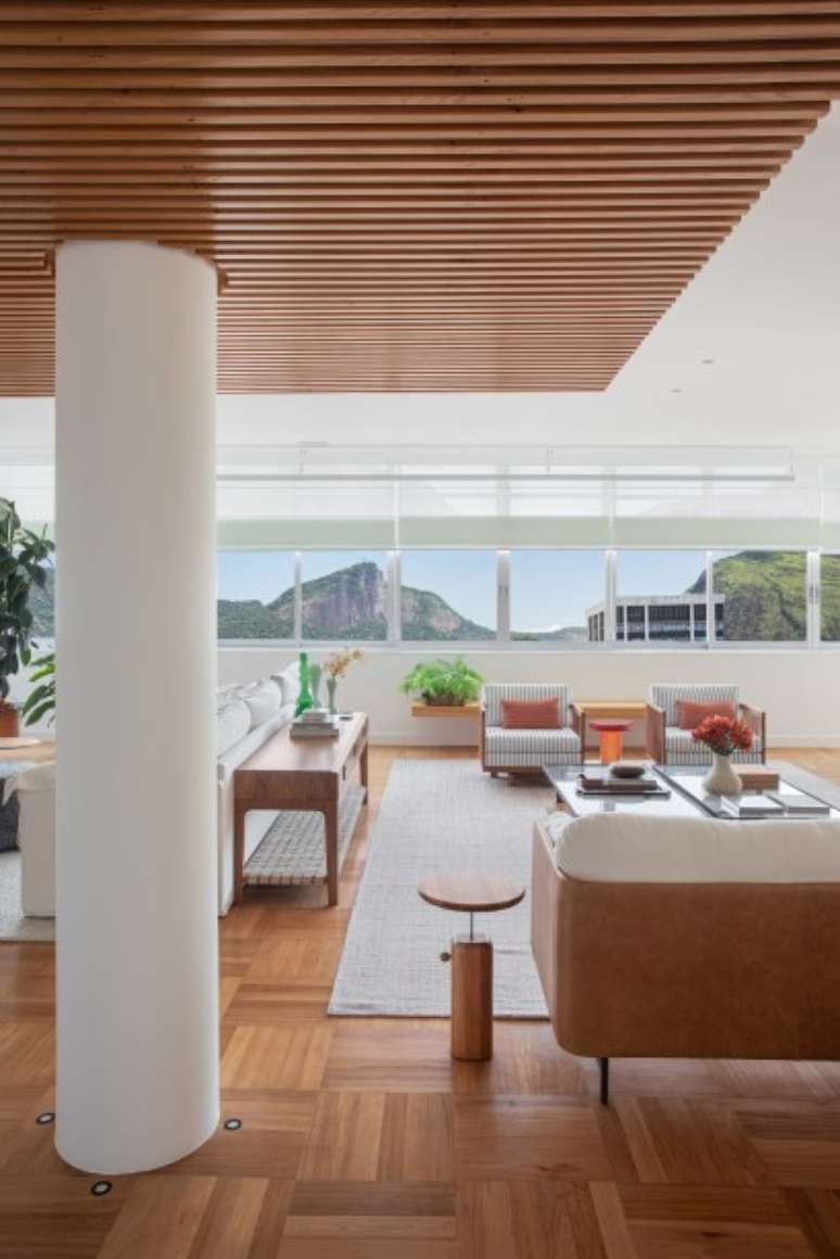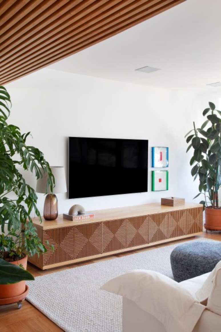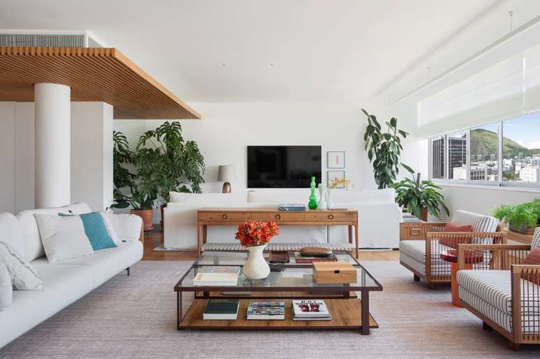 Destaque para a imensa estante - que funciona como apoio à sala de estar e se estende até o jantar fazendo as vezes de aparador -, o rack sob a TV com portas treliçadas em muxarabi e o teto ripado na entrada da sala, que também esconde as máquinas de ar condicionado), combinada com painéis de parede brancos. Cortinas de linho, estofados em sarja, algodão, linho e couro e tapetes de PET complementam a base do décor.