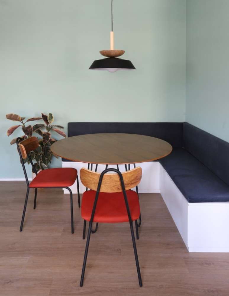 O canto alemão com baús profundos que servem para guardar objetos e outros itens da casa, também permite mais pessoas sentadas ao redor da mesa com duas cadeiras, o que facilita na circulação pelo espaço.