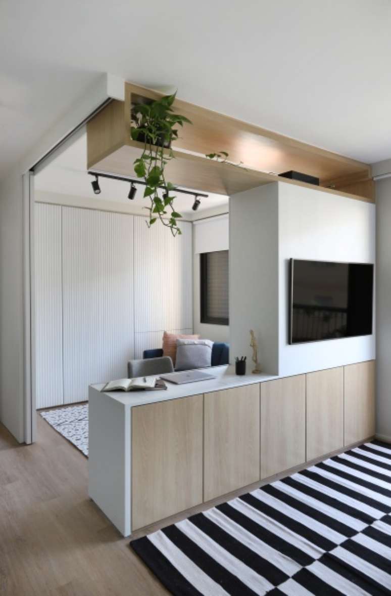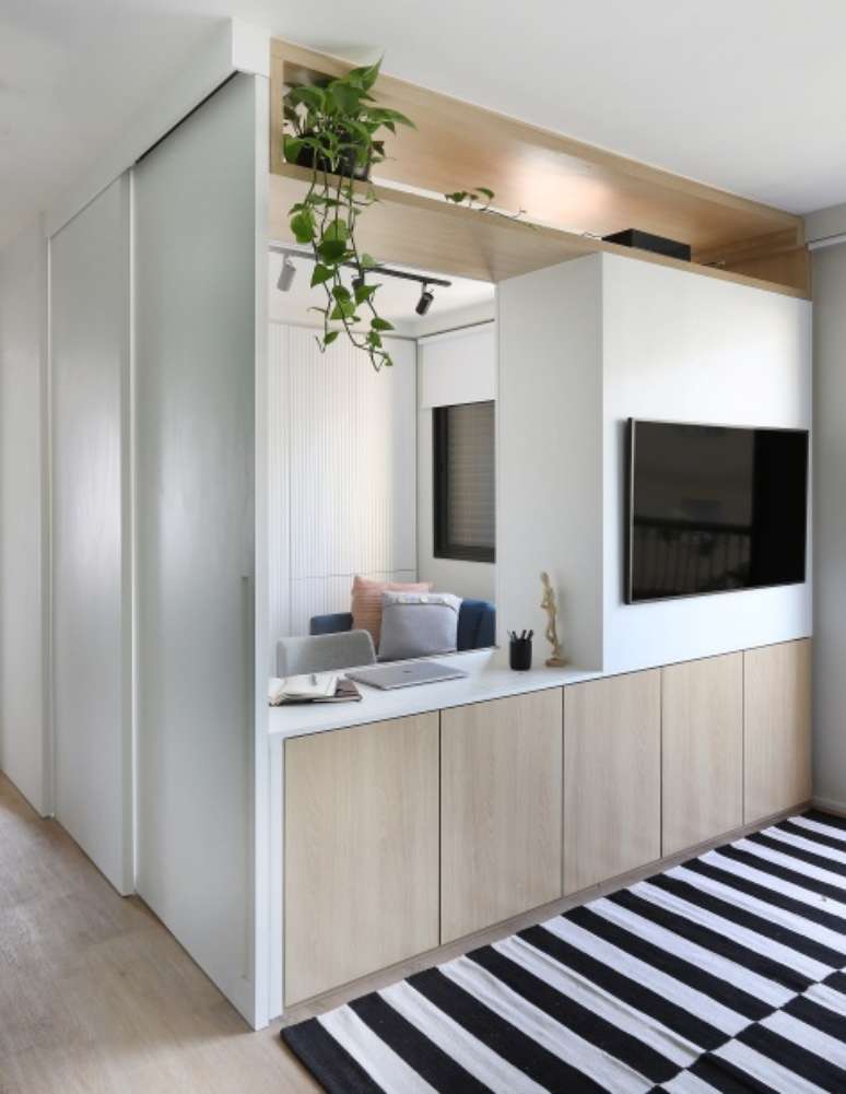 Este móvel multifuncional atende aos dois ambientes. Na sala com painel no qual foi instalada a TV, cuja continuidade é a bancada do home office que delimita os dois ambientes, acima uma prateleira vazada para manter ventilação e luminosidade.