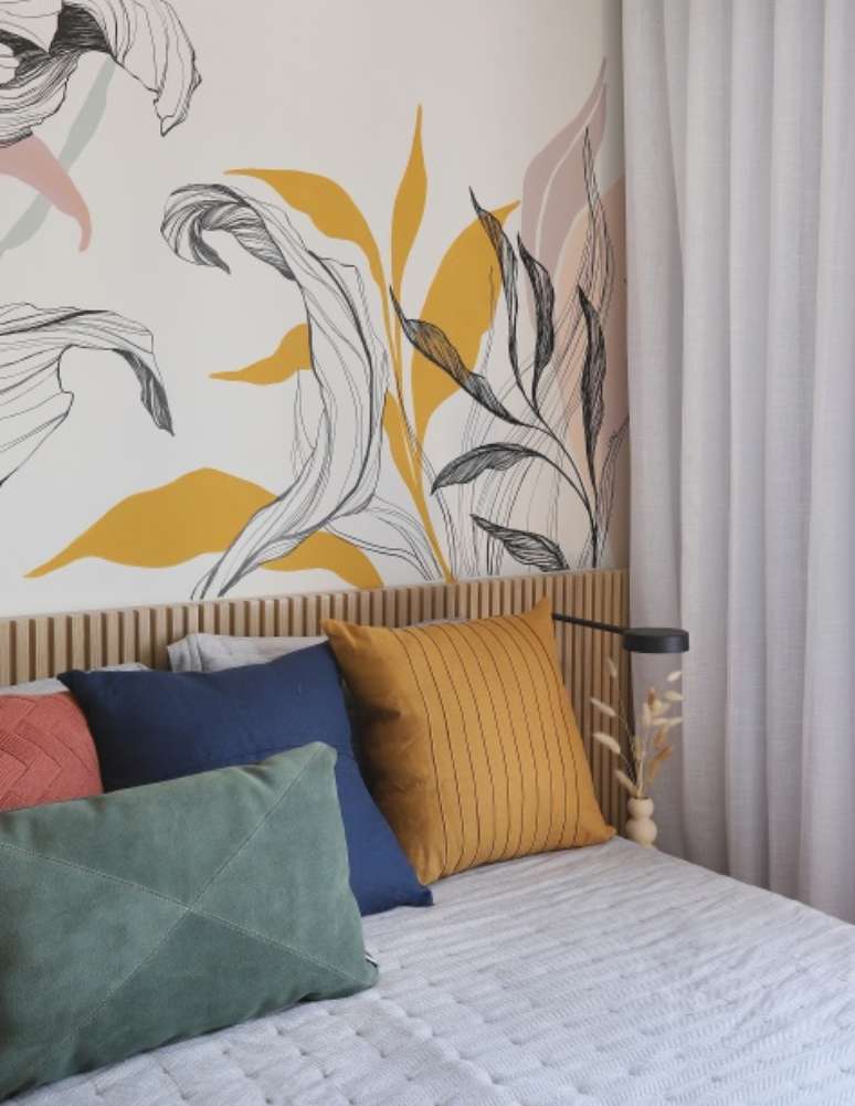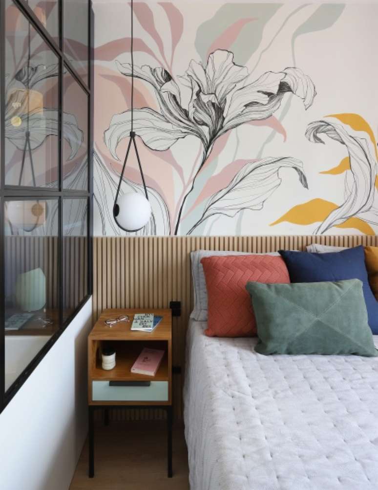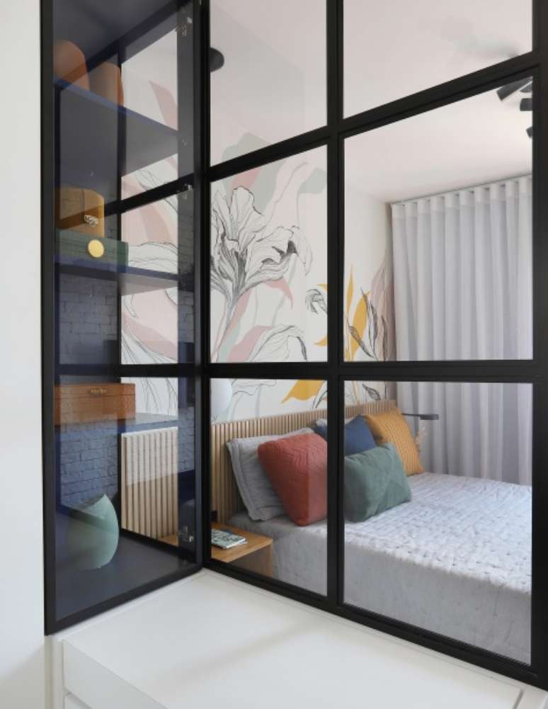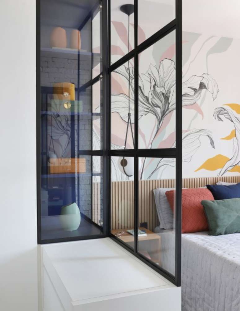 Uma das exigências da moradora era criar um home office que também pudesse servir de quarto de hóspedes, porém, ela não queria ficar isolada em um espaço, portanto, este ambiente deveria ser integrado e ao mesmo tempo manter uma privacidade à visita esporádica.