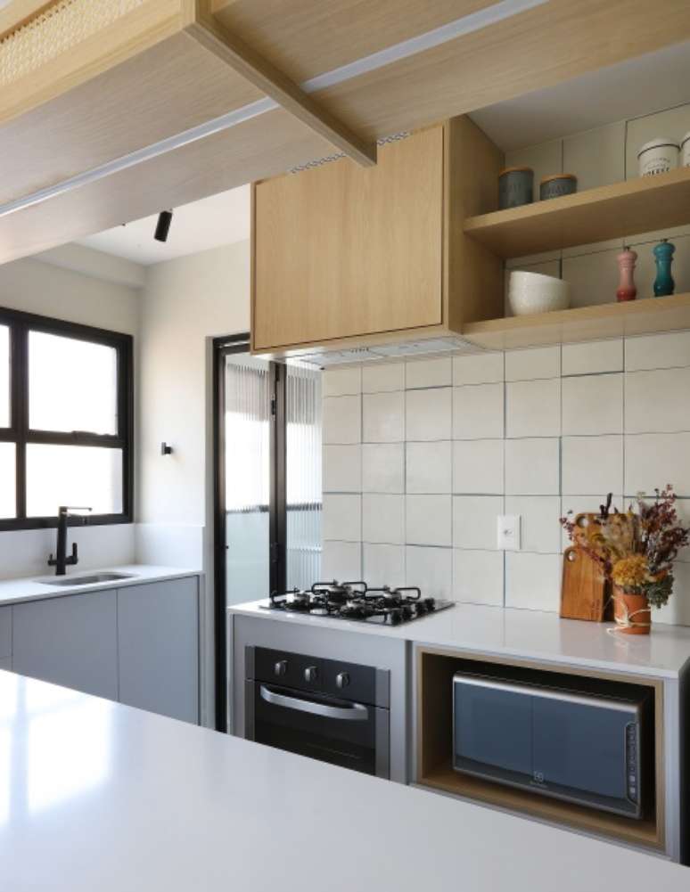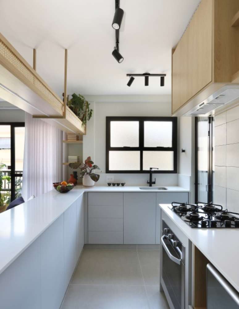 A primeira providencia foi quebrar a parede e integrar a cozinha à sala com uma bancada com 4 metros de comprimento que segue em L até a área molhada que foi deslocada para a parede onde há a janela, que antes ficava o fogão.