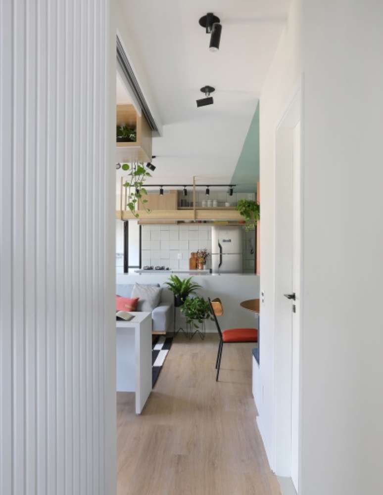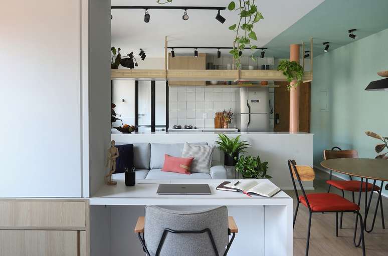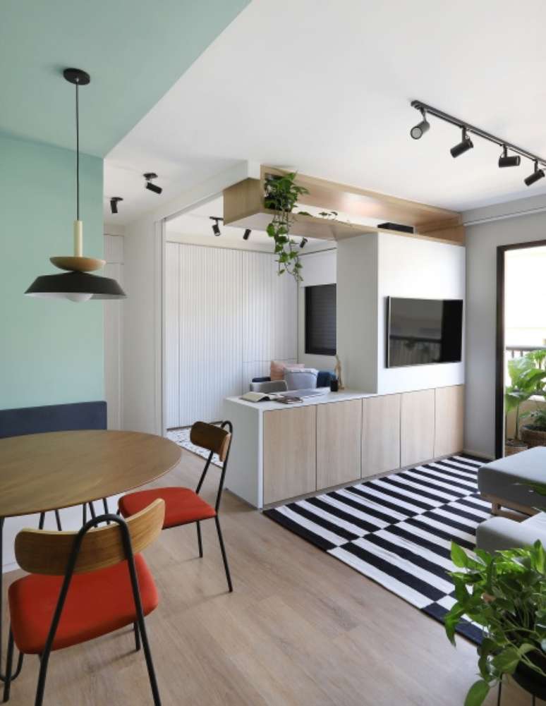 Reforma traz integração, espaços de armazenamento e cores para apê de 63m²