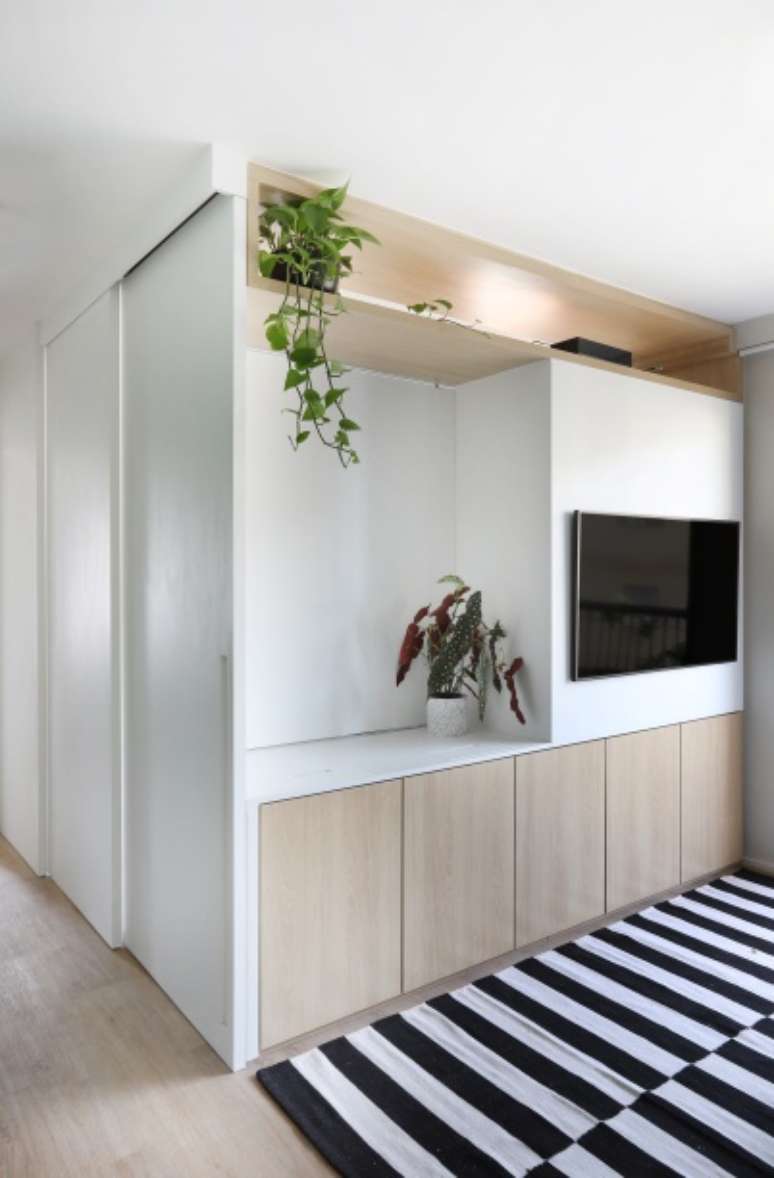 Este impasse foi logo solucionado pelas arquitetas que retirou a parede do segundo quarto e o integrou à sala com um móvel desenhado pelo próprio escritório.