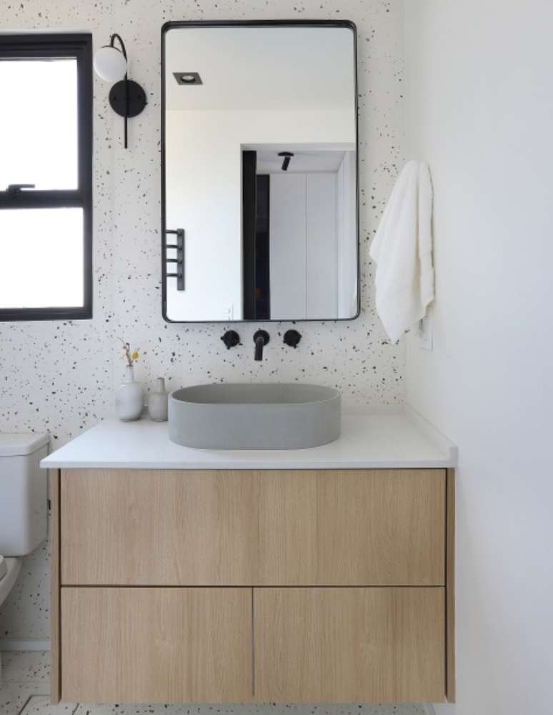 Ao quebrar a parede, descobriu-se uma tubulação de esgoto do prédio, mas isso não foi problema para o escritório, que a incorporou ao novo projeto, deixando-a aparente e se transformando em um dos destaques charmosos do apartamento.