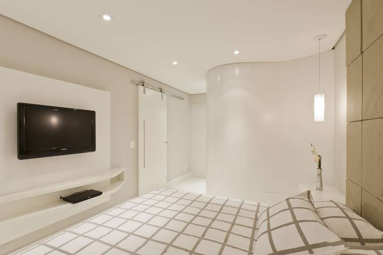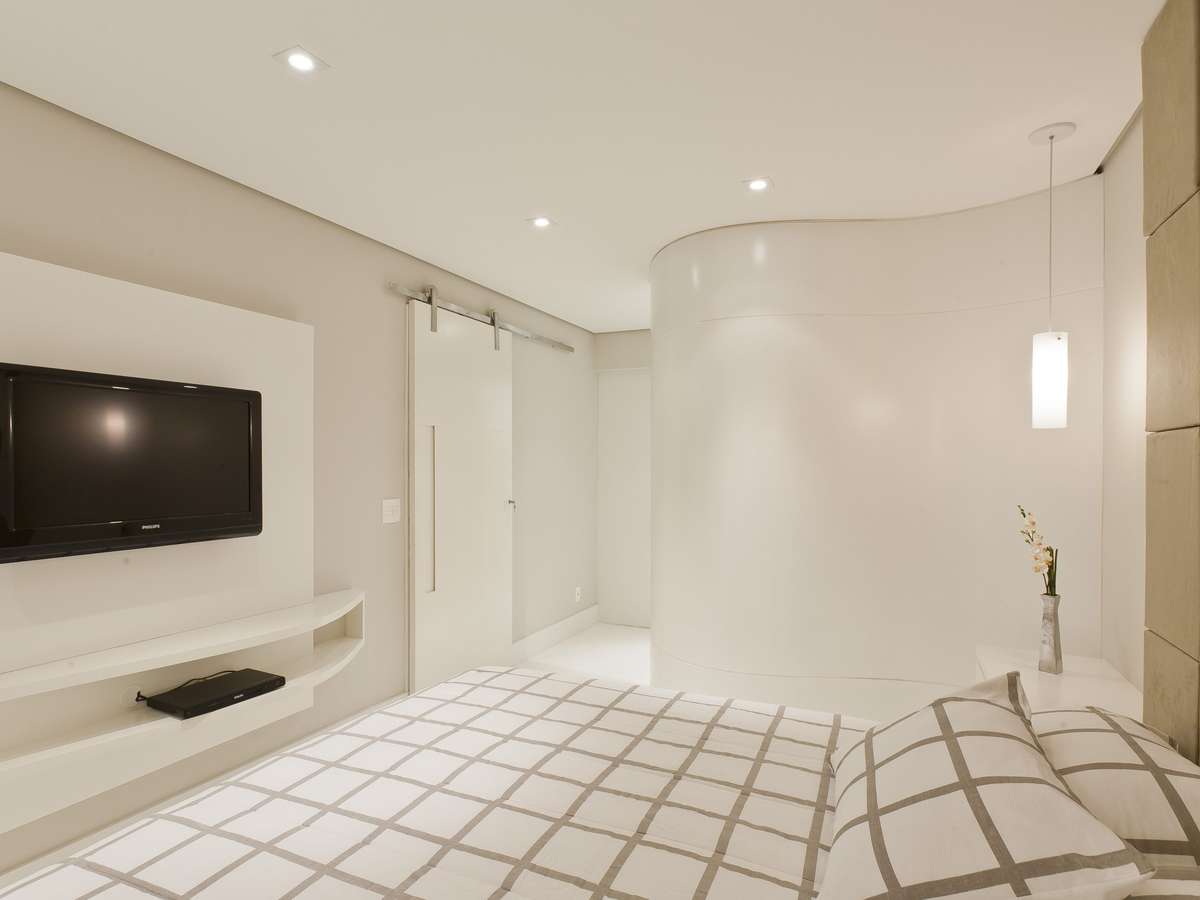 A predominância do branco e do estilo minimalista foi uma escolha do proprietário, que havia se encantado com um quarto todo nessa cor, num hotel em que se hospedara em Madri