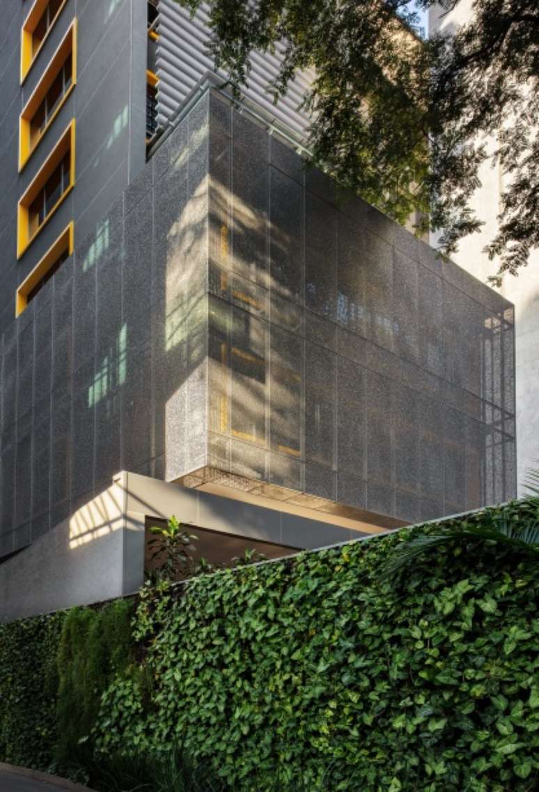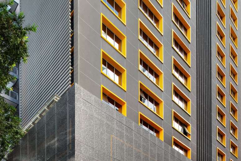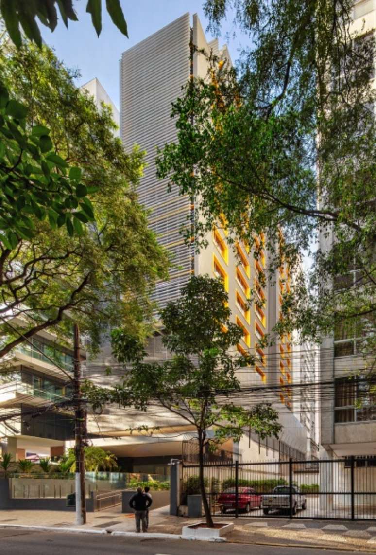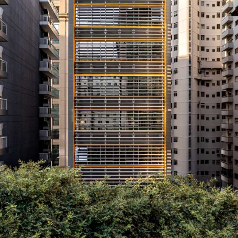 No corpo da torre, as fachadas, frontal e de fundos, recebem proteção ambiental em perfis horizontais de alumínio que, fixados também em montantes metálicos destacados do edifício, unificam visualmente os pavimentos. Os novos e ampliados caixilhos, com vidros de alto desempenho térmico e baixa refletância solar, ampliam as vistas, promovem a ventilação natural cruzada e valorizam o edifício.