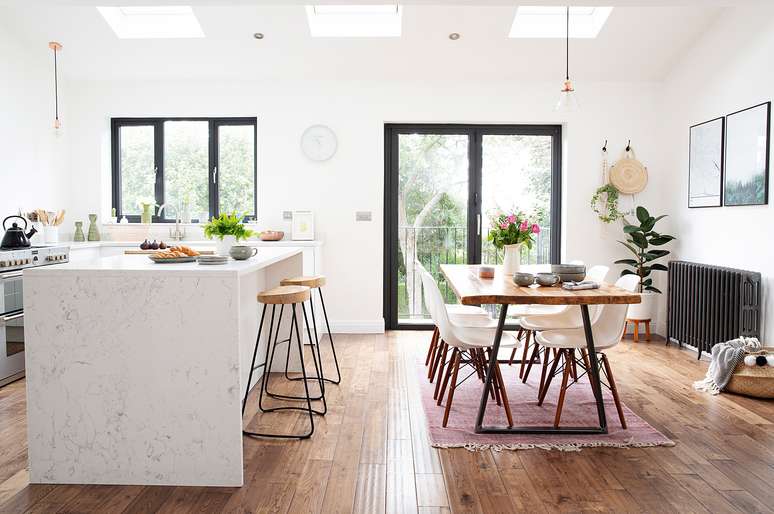 Embora não achemos que as cozinhas brancas irão desaparecer totalmente, espere ver mais donos de casas experimentando armários e eletrodomésticos brilhantes e ousados. Dos vermelhos vibrantes aos rosa suaves, é uma boa hora de abraçar a cor na cozinha.