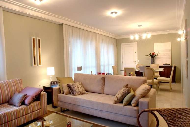 Neste projeto, o sofá fica encostado na bancada da cozinha, que tem nichos na lateral para guardar garrafas. A sala de jantar, com o banco em L, permite acomodar mais pessoas. O projeto é das arquitetas Giselle Macedo e Patrícia Covolo