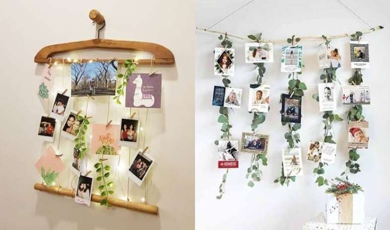 Se quiser inovar ainda mais, crie um cabide com uma haste de madeira, isso vai dar um ar mais rústico para o ambiente. Também é possível colocar algumas folhas e flores entre as fotos para deixar a decoração mais charmosa.