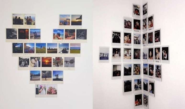 Se quiser uma decoração mais simples, pode optar por colar suas fotos na parede formando desenhos criativos. Isso vai desde formatos como pirâmides e diamante, até de coração.